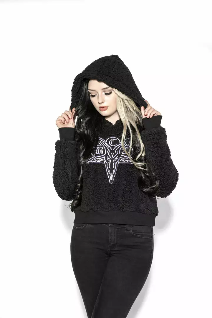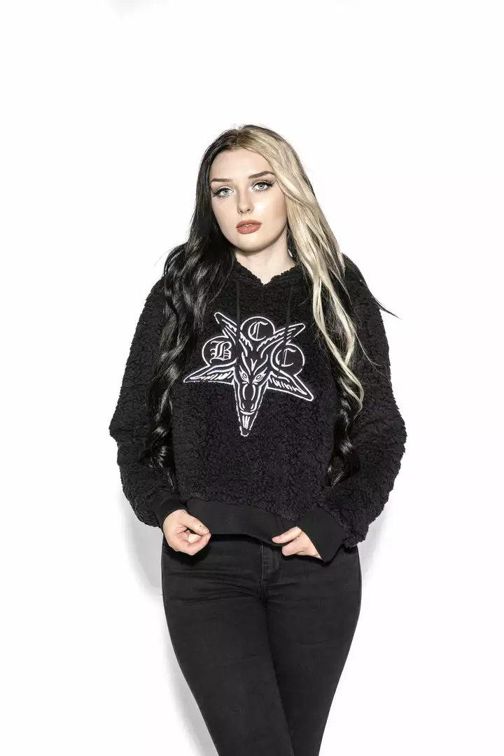 Women’s Sherpa Hoodie in an elongated crop length with BCC Goat patch on the front.