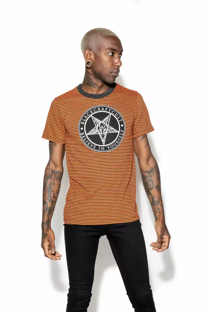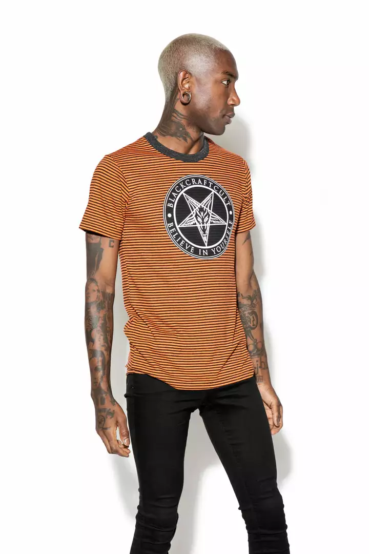 Unisex orange striped tee with Believe in Yourself logo print across the chest.