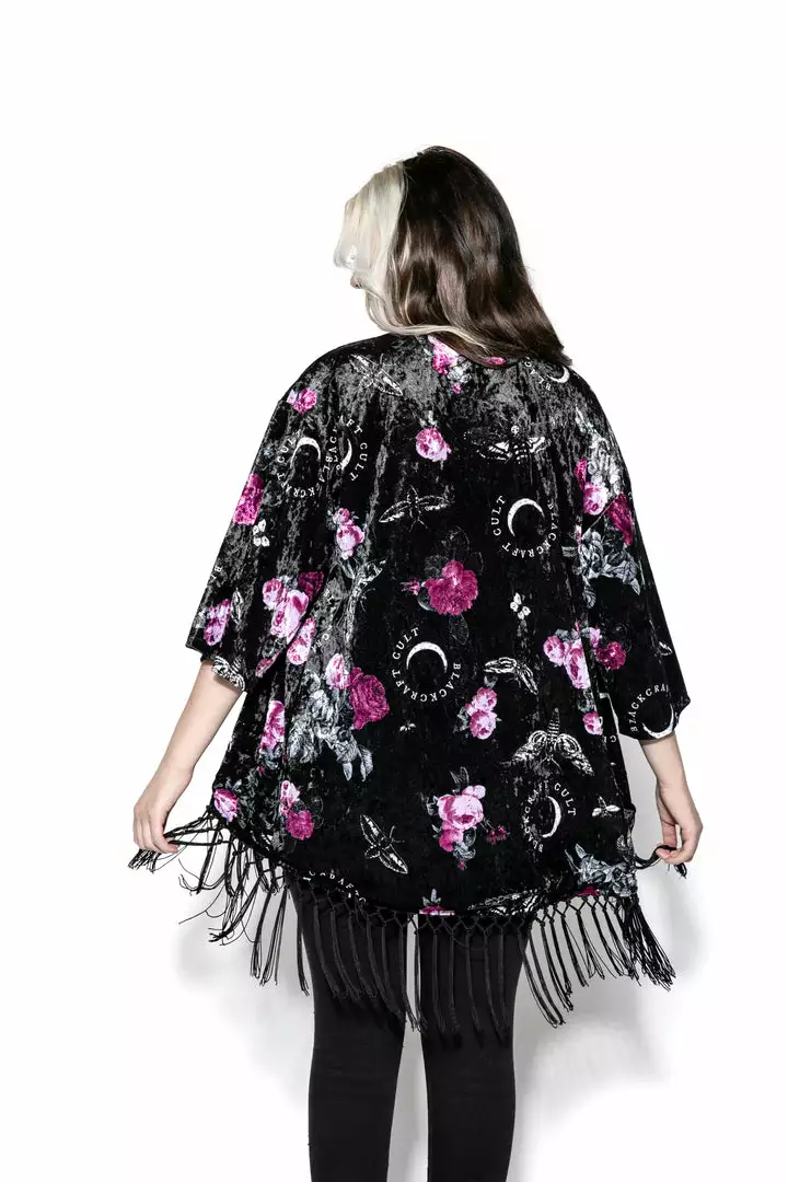 Women’s Oversized kimono with crochet fringe detail at bottom.