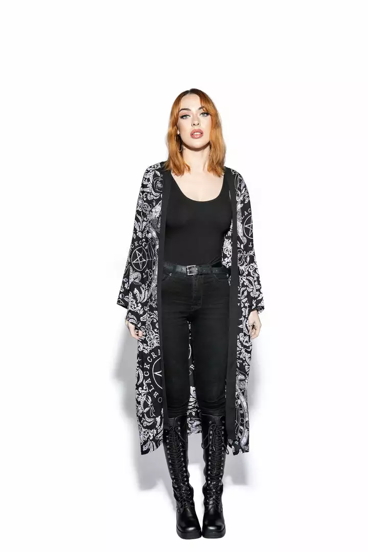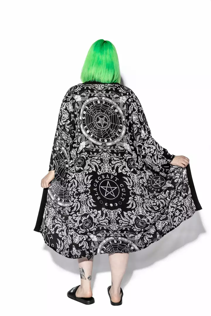 Women’s Oversized kimono with crochet fringe detail at bottom.
