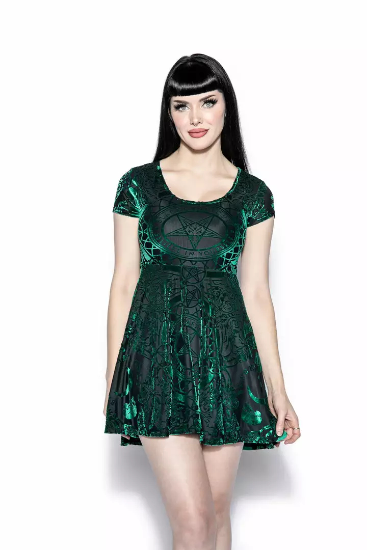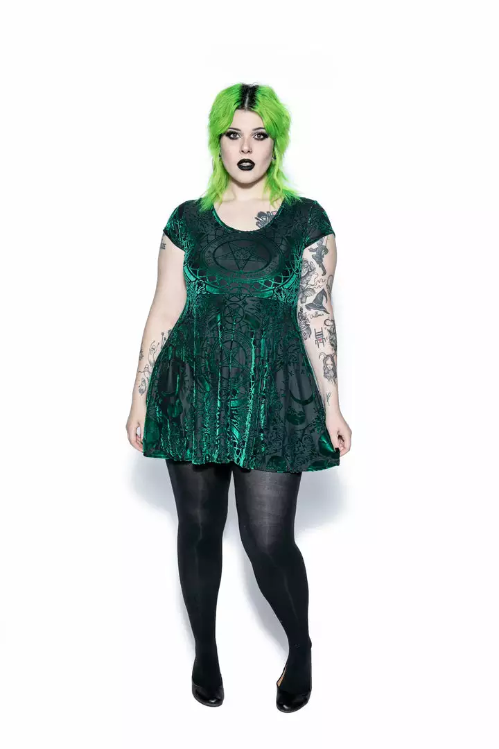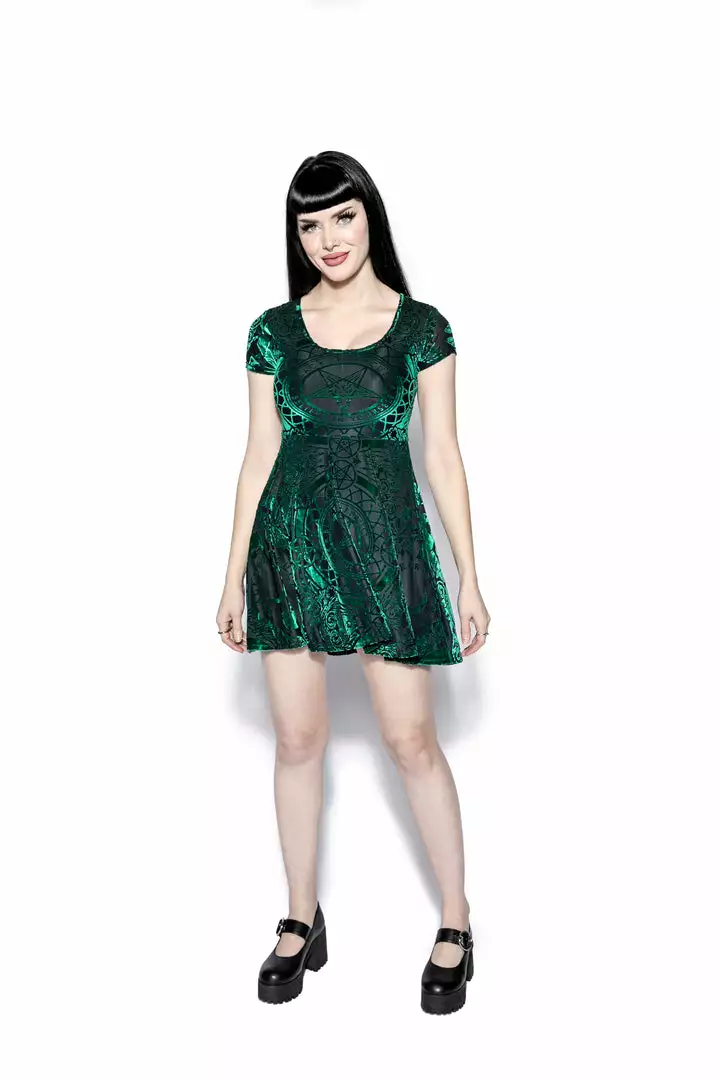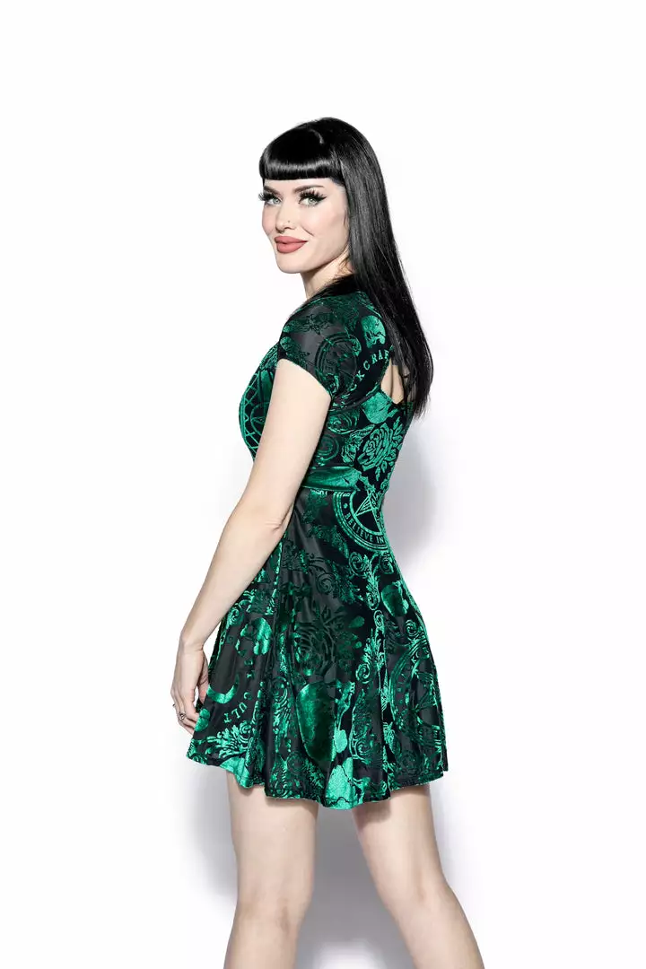 Part of the green velvet collection, the dress comes in a luxurious green baroque style with a small lace-up and open back details. It features a short sleeve, cinched waist, and flared skirt. It is soft to the touch with a slight stretch.