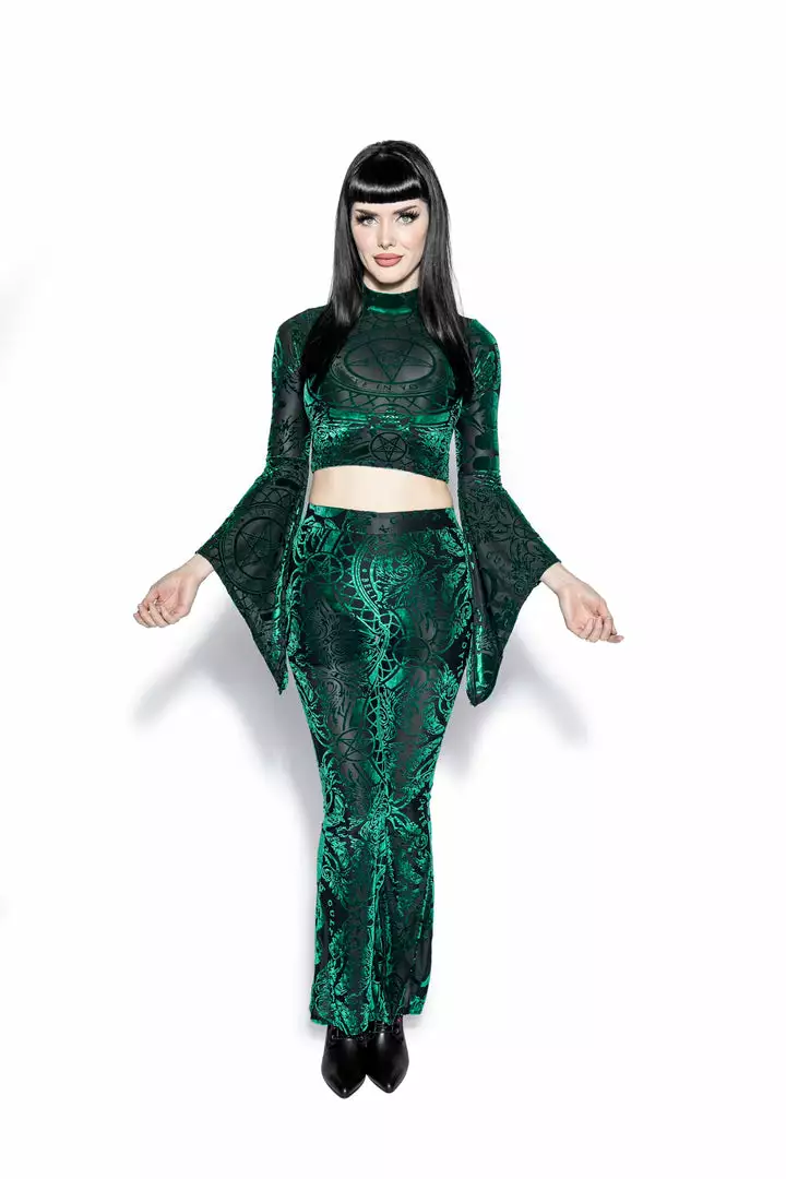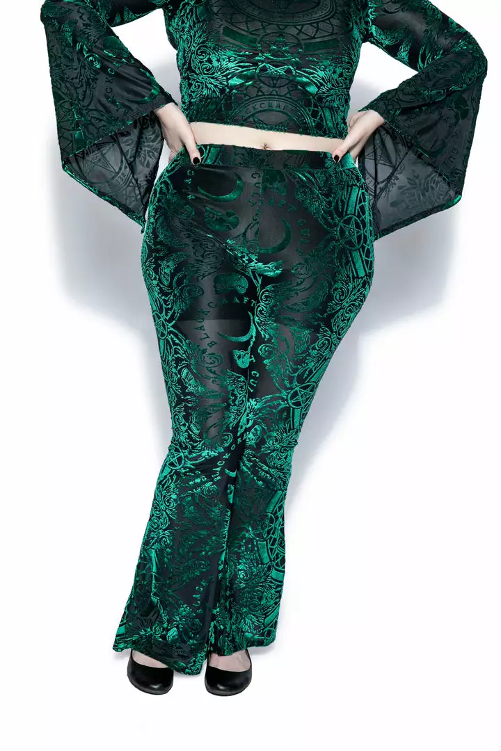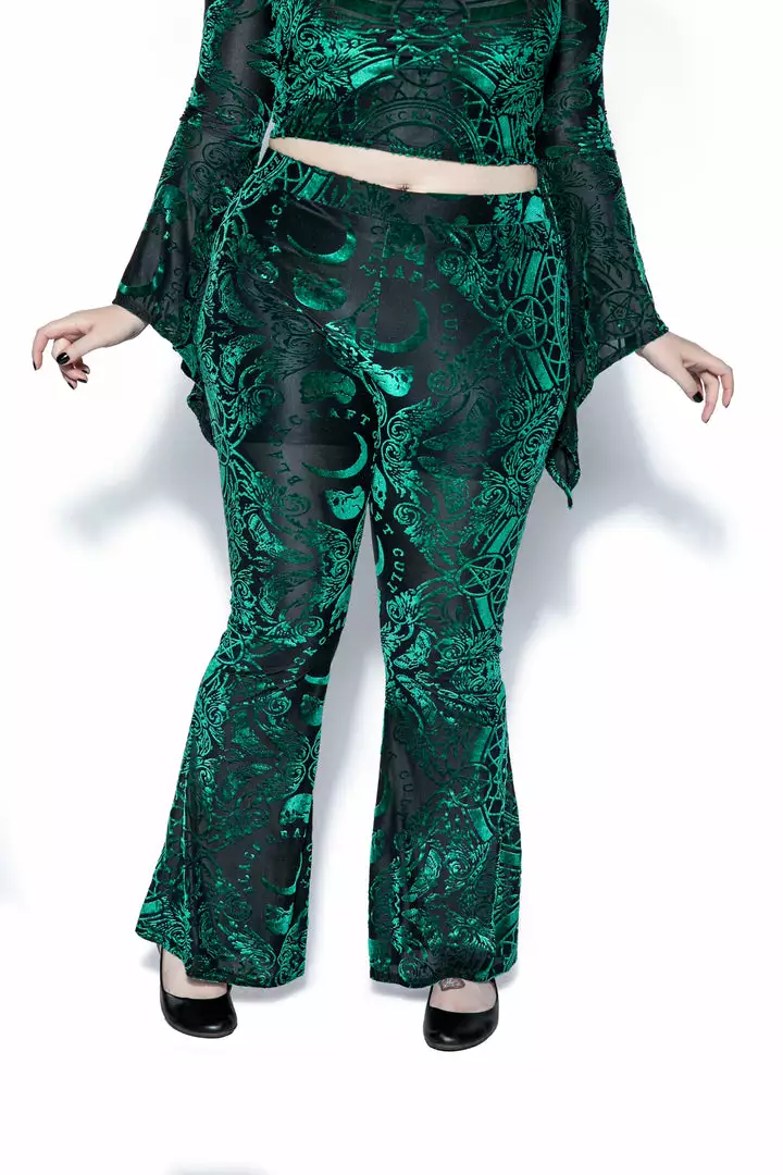 Part of the green velvet collection, the pant comes in a luxurious green baroque style with a high waist. It features a fitted leg with a flared bottom, fitted waist, and black shorts sewn in (because pants are somewhat see-through). It is soft to the touch with a slight stretch.