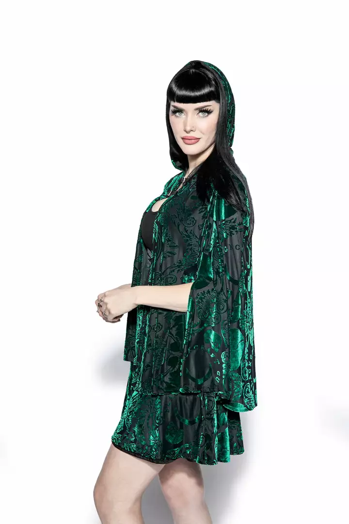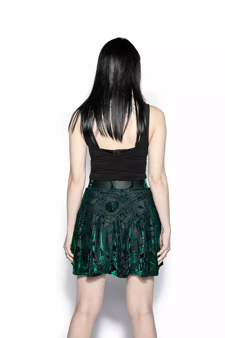 Part of the green velvet collection, the skirt comes in a luxurious green baroque style with a high waist. It features a fitted waist and flared skirt. It is soft to the touch with a slight stretch.
