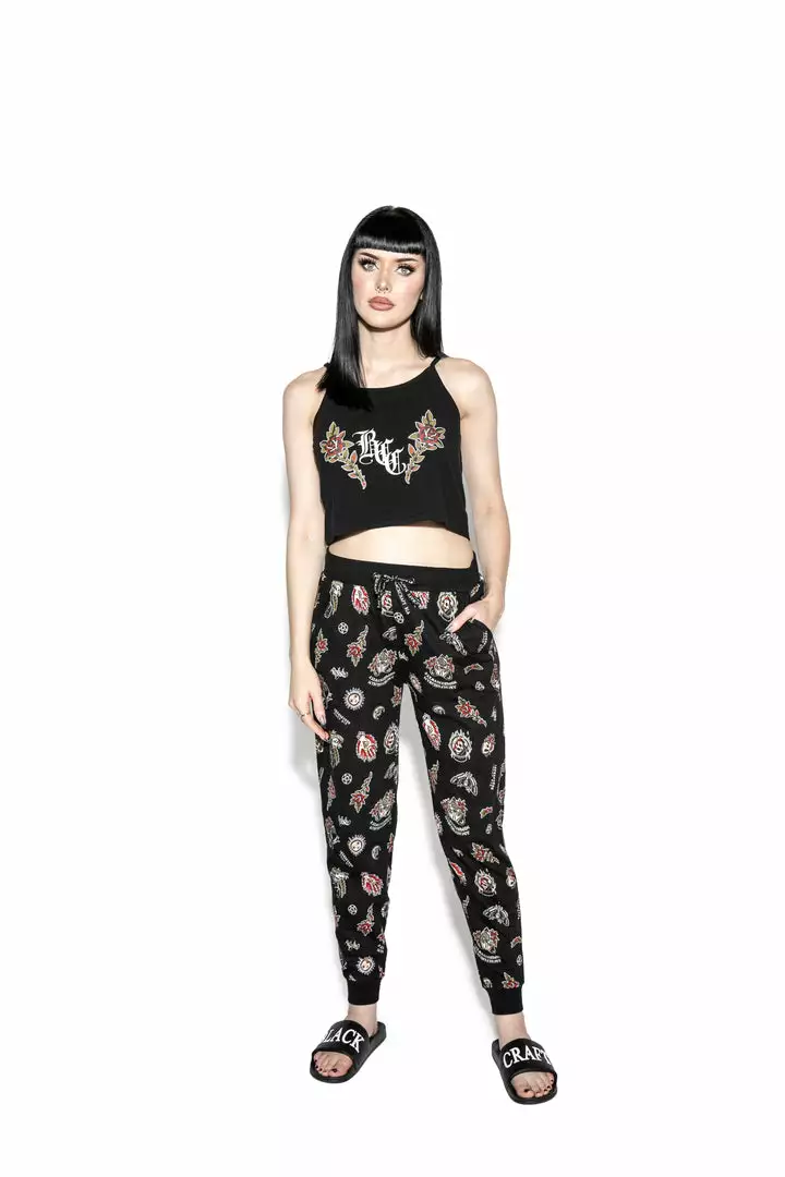 Two-piece jogger pajama set with all Ouija Flash design and BCC logo. Mid-length tank top with jogger pajamas.