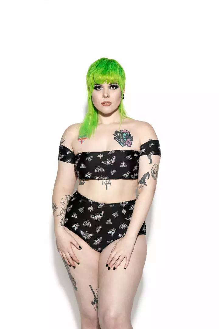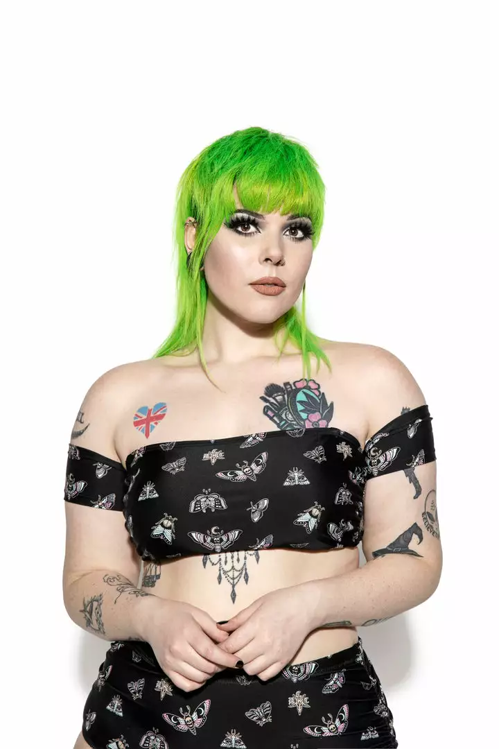 Green haired model wearing size 2X
