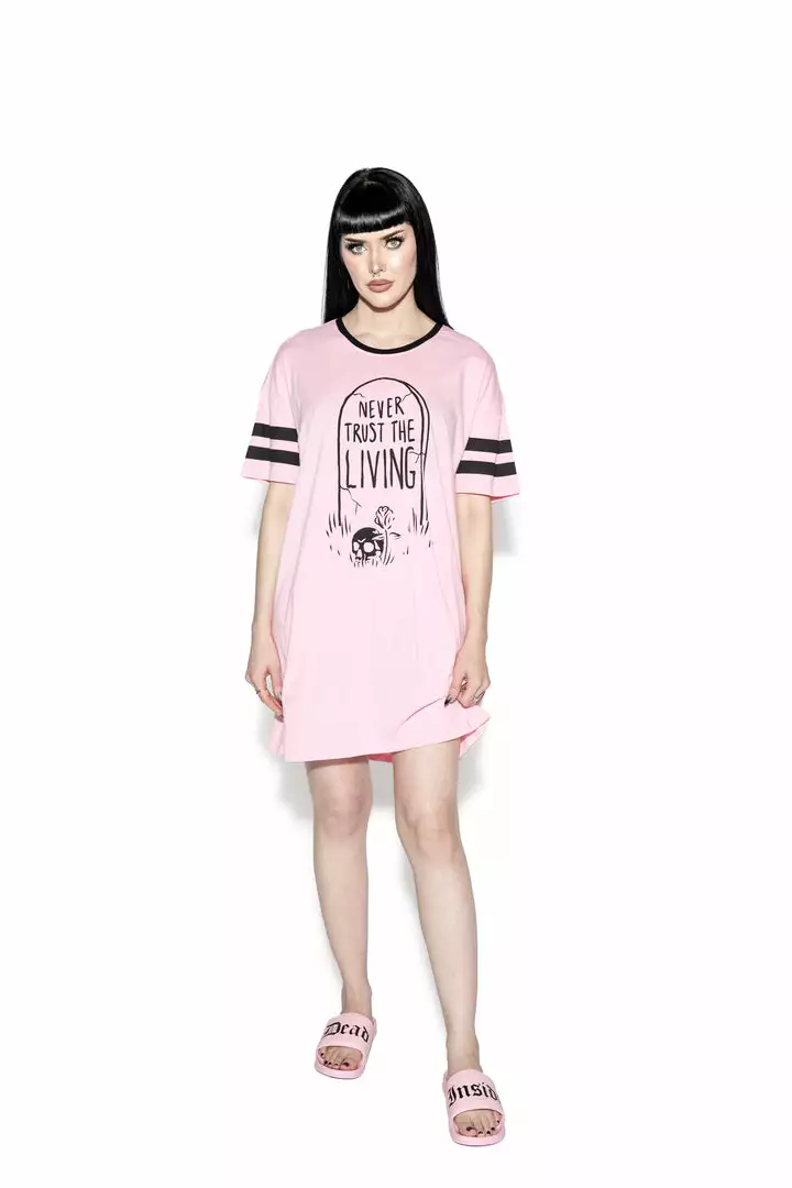 Junior and plus size dorm shirt in pink with Never Trust the Living print across the chest. Black stripe accents on sleeves and neckline.