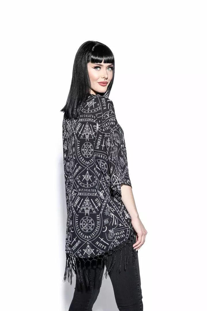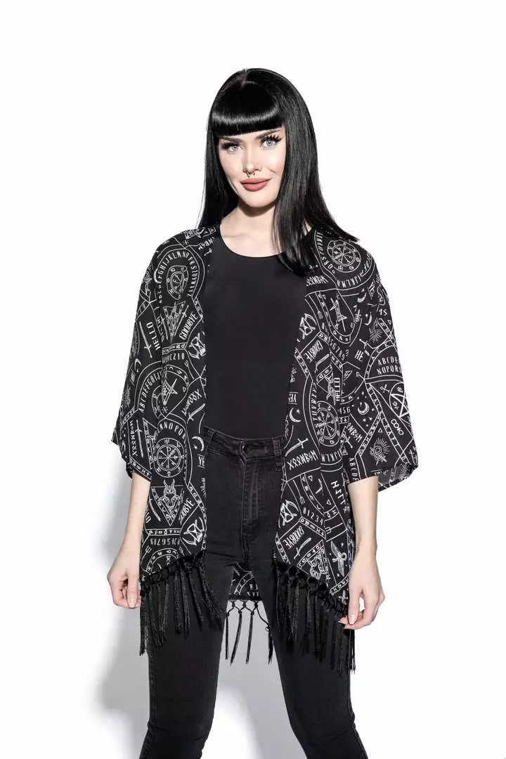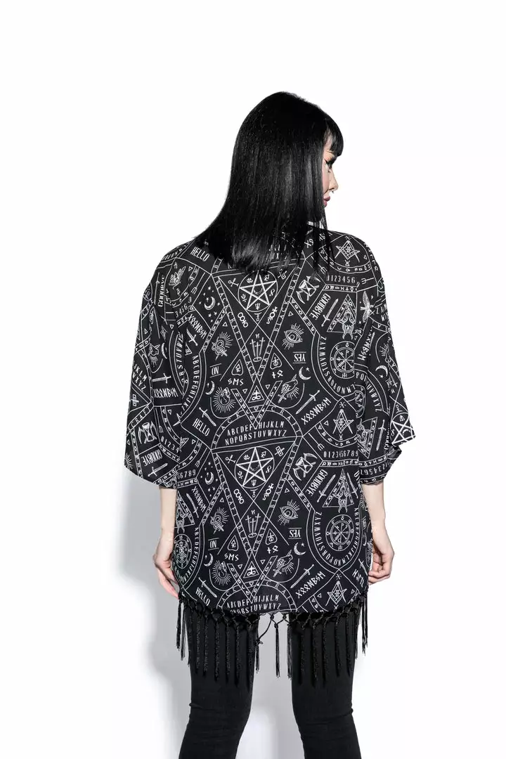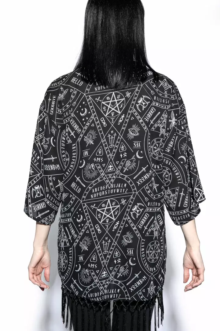 Women’s Oversized kimono with crochet fringe detail at bottom.