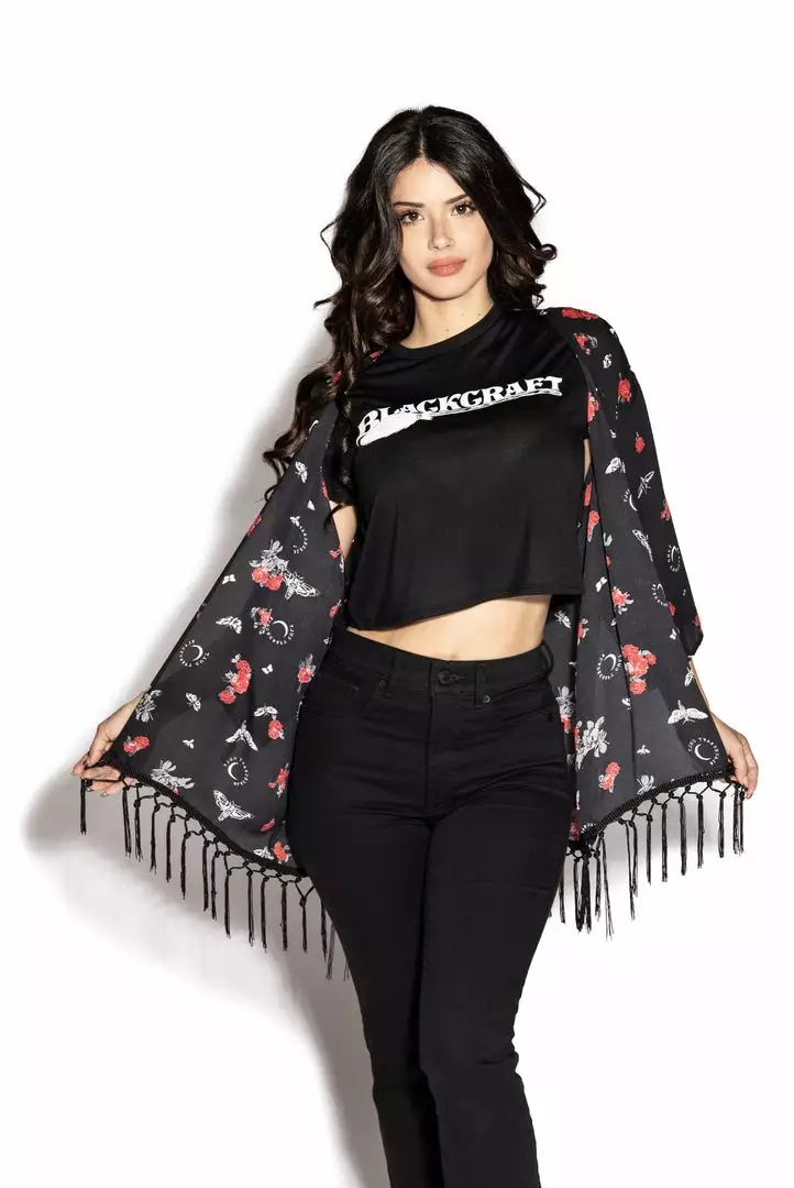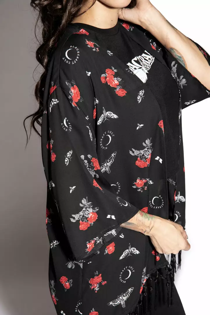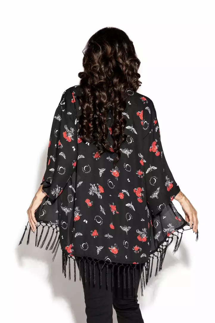 Women’s Oversized kimono with crochet fringe detail at bottom.