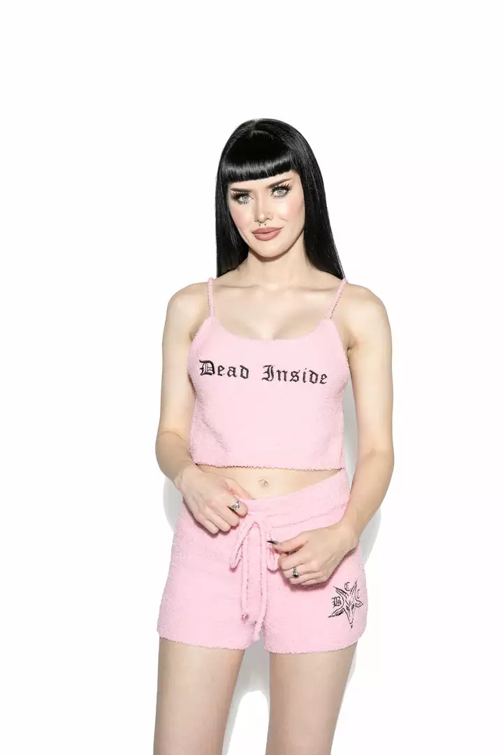 Cozy Sherpa pajama sets have arrived! The set contains a cropped camisole top and drawstring shorts. The pink set features a black embroidered “Dead Inside” across the chest and BCC goat on the leg.