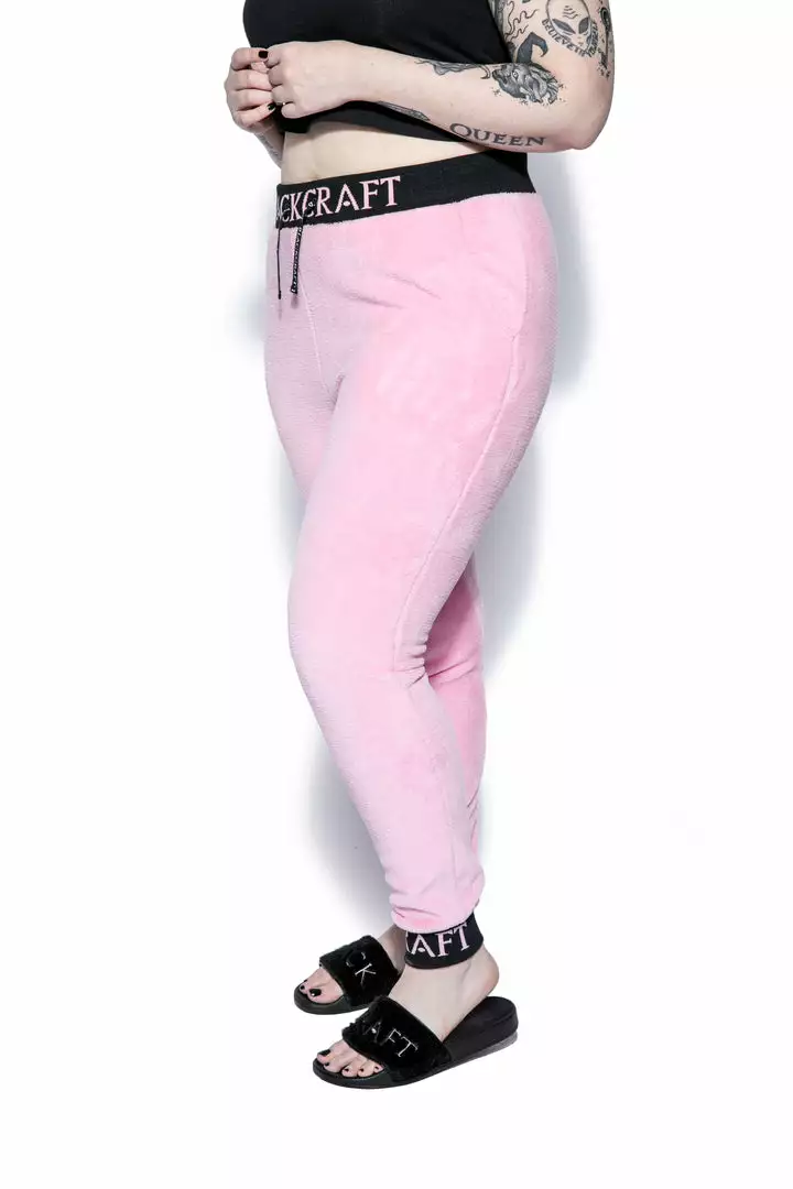 Cozy pink sherpa joggers with Blackcraft logo waistband, drawstrings, and ankle cuffs.