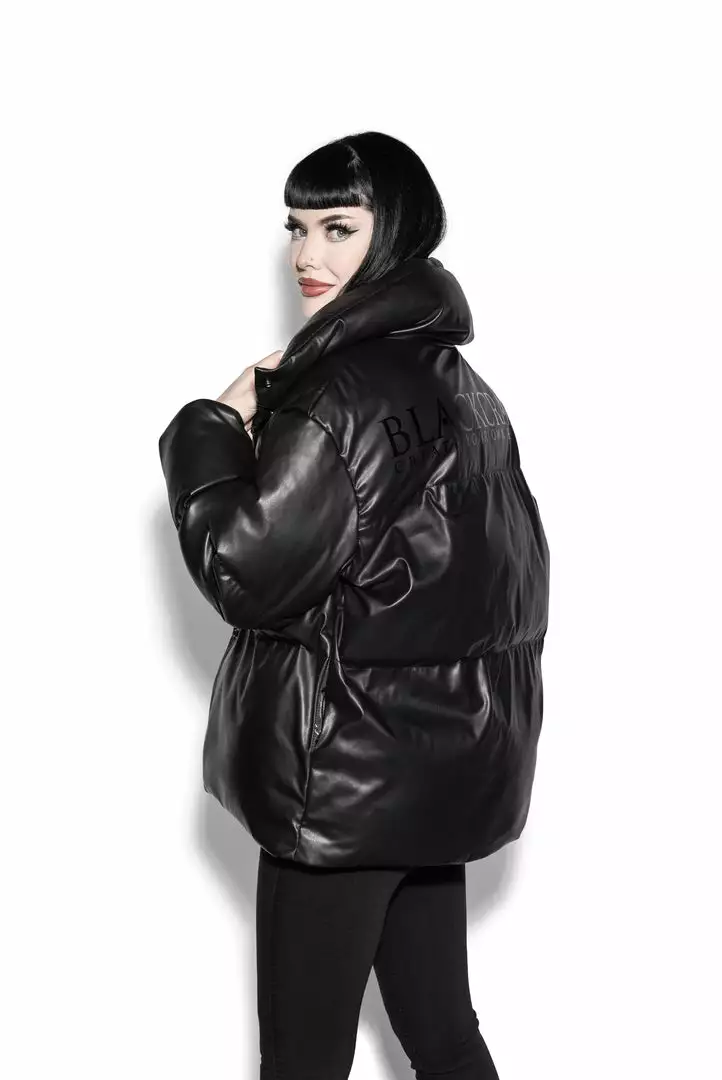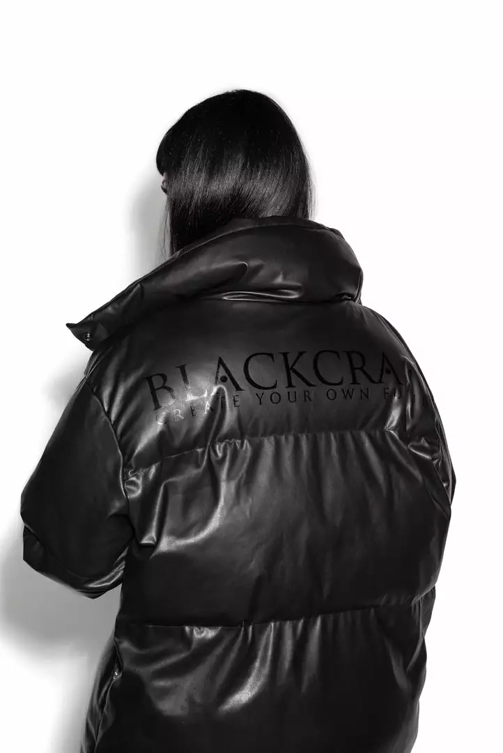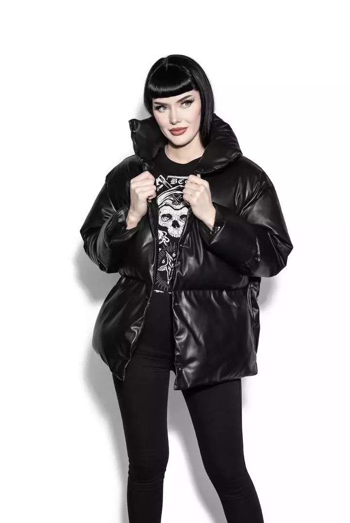 Chic faux leather puffer with black on black logo embossed across the back. Comes in an oversized, casual fit and high collar to keep warm in the cold…or to hide your face. Features pockets and snap button closure.