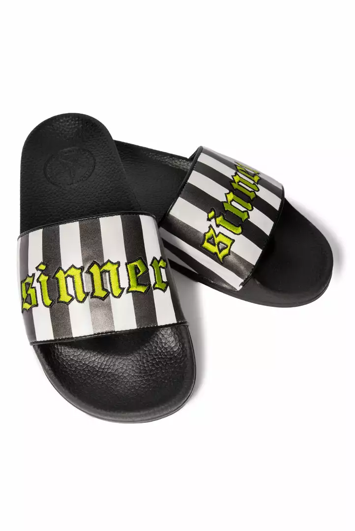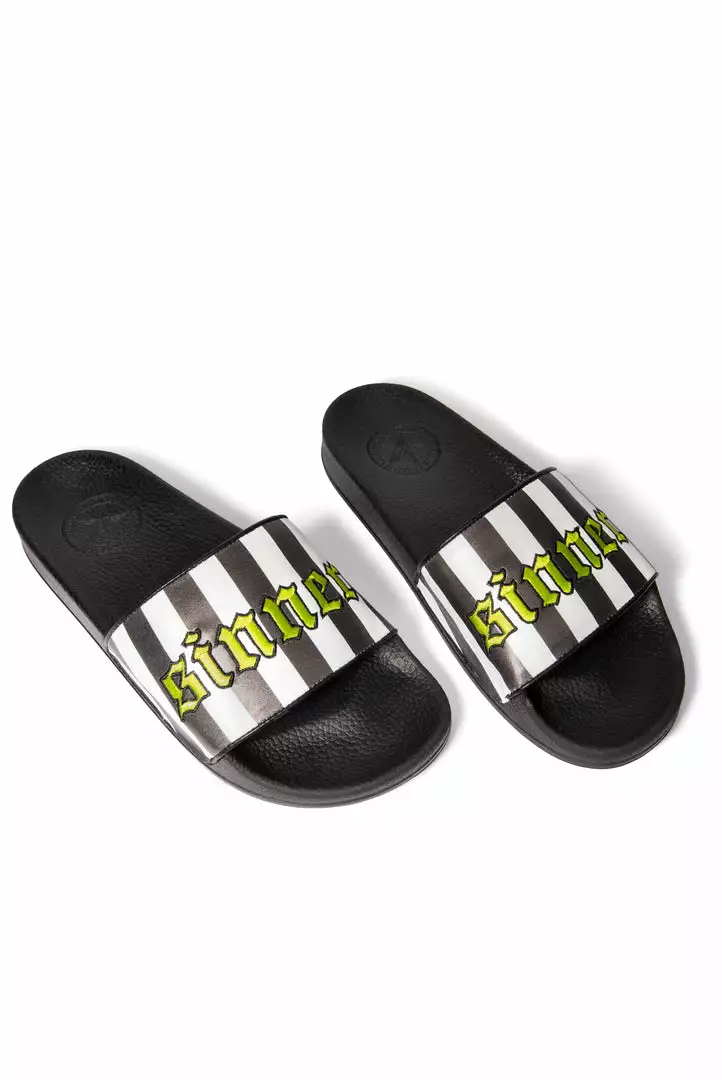 Premium quality pool slides with striped faux leather strap and sinner embroidery.