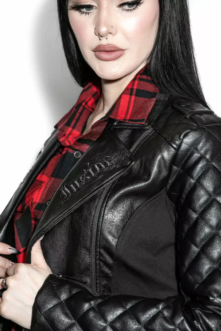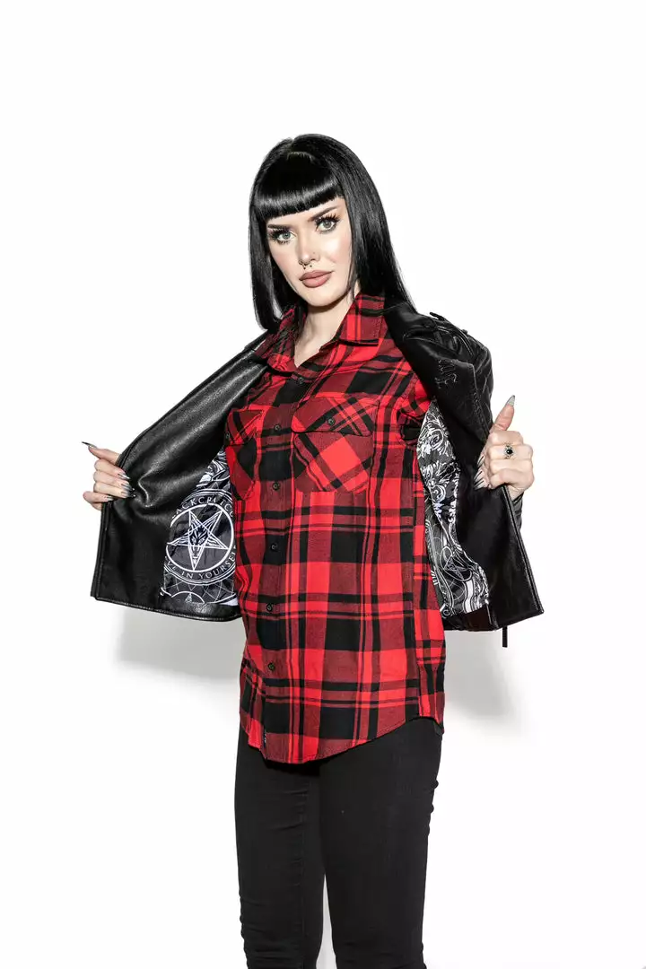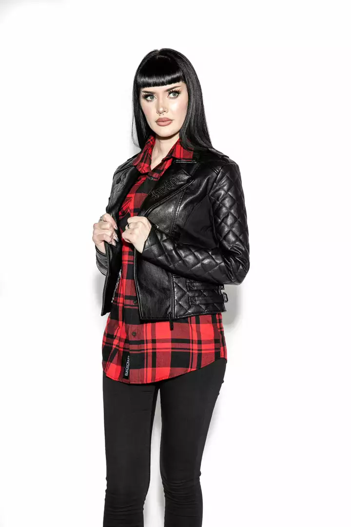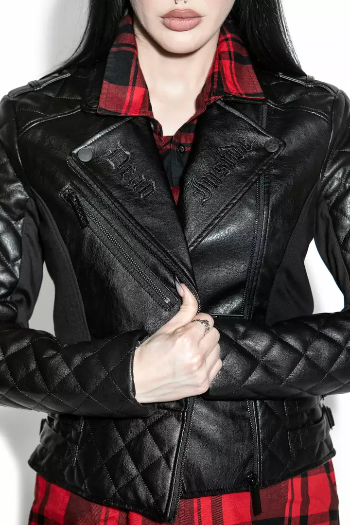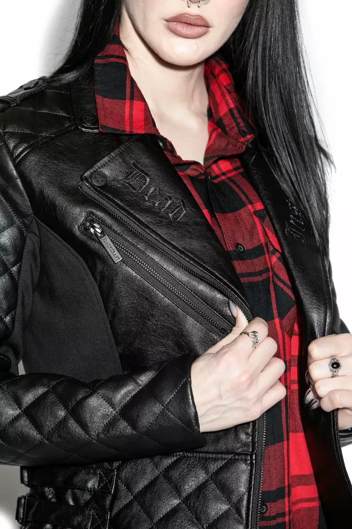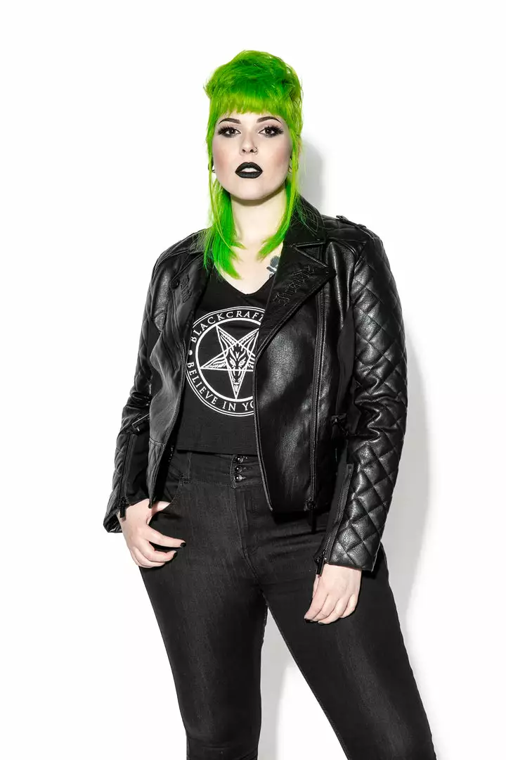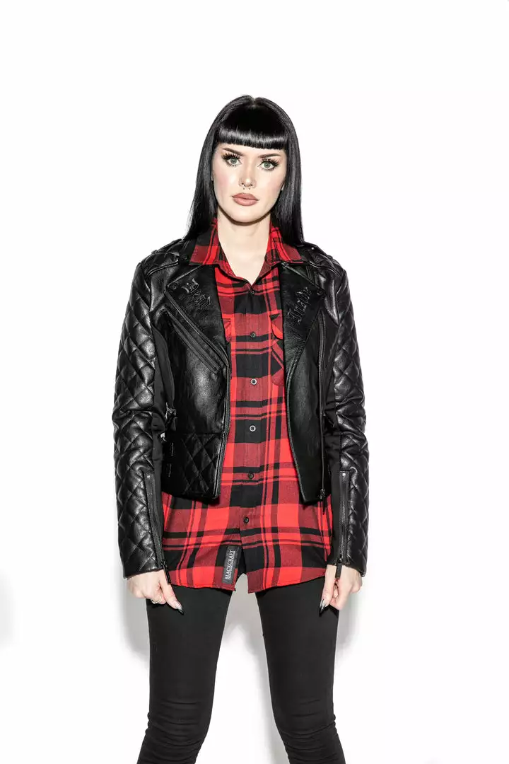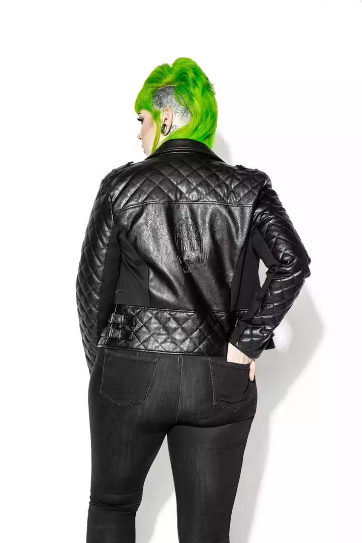 Our faux leather Women’s Moto Jacket comes with custom Blackcraft pentagram matte black buttons, custom lining & collar, and custom zipper pulls. It also has quilted arms and back with a smooth center, and buckle details on the sides. The back features an embossed Never Trust the Living graphic.