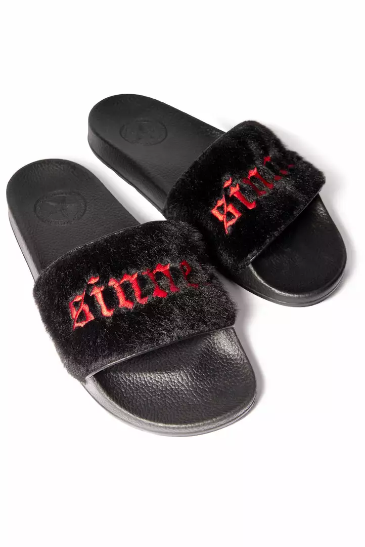 Premium quality pool slides with faux fur strap with sinner embroidery.
