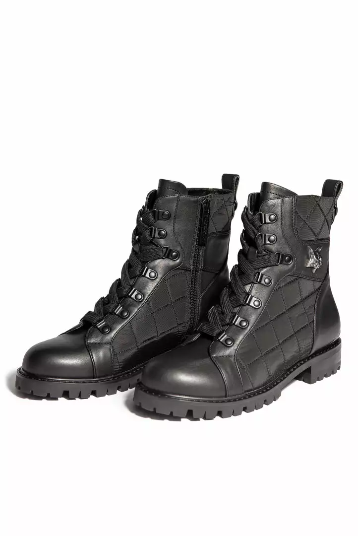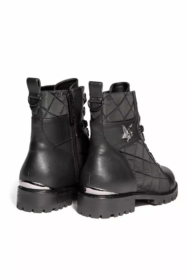 Combat boots for any occasion. The boot features mixed materials of smooth PU leather and quilted nylon. Has a zipper closure and laces with matte black hardware. Stunning new Hell Cat hardware in antiqued silver on the side and gunmetal accent on the heel.
