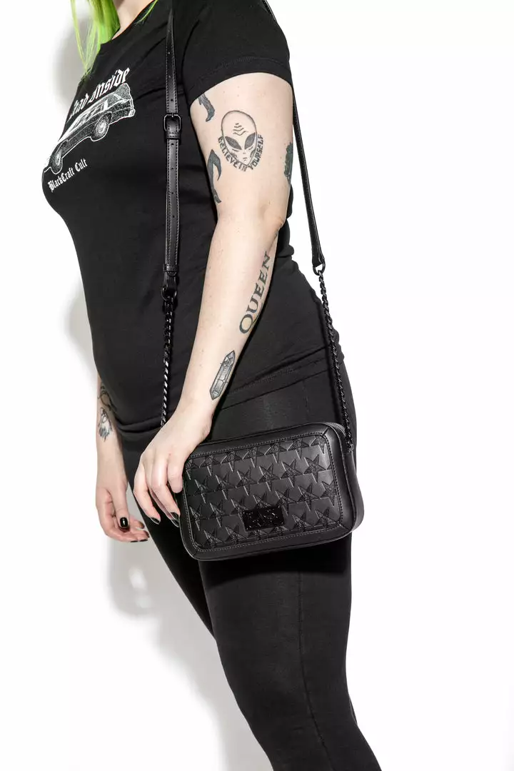 Faux leather crossbody embossed with allover baphomet print. Gunmetal finish logo zippers and logo plaque.