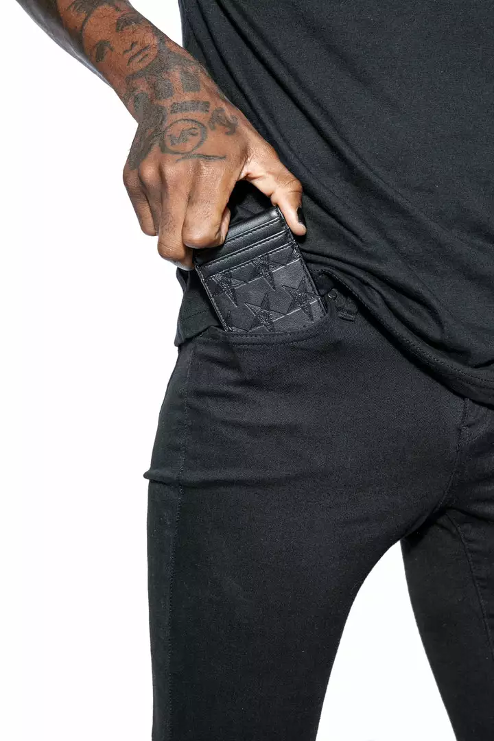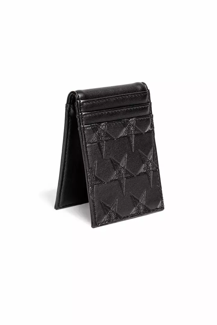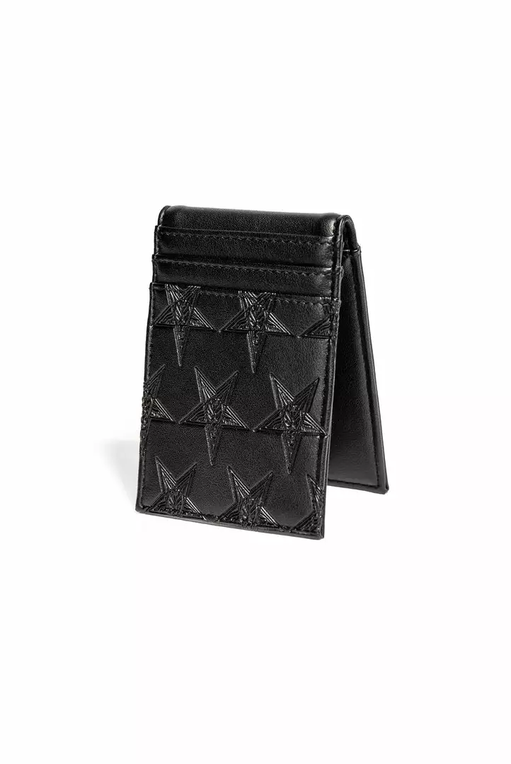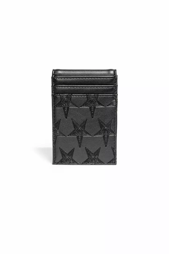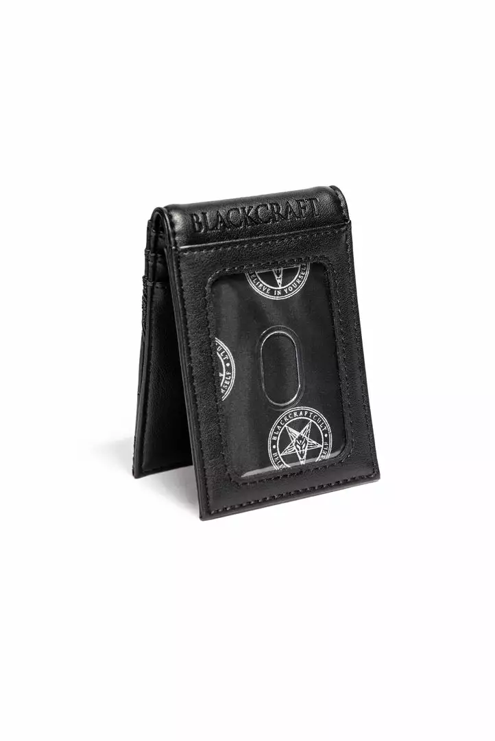 Baphomet embossed, faux leather front pocket wallet. Features 4 internal card slots/pockets and 3 external card slots/pockets and 1 external ID slot.