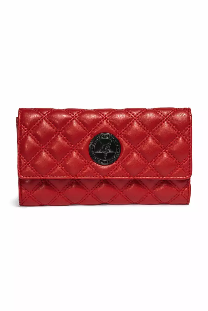 Faux leather slim clutch wallet features quilted design with matte black hardware. Includes 15 credit card slots, interior pockets, zip pockets.