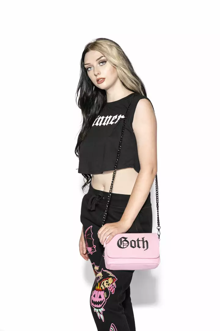 “Goth” embroidered text on faux leather crossbody with matte black finish hardware and premium quality chain. Removable crossbody strap allows to be carried as a clutch. Custom interior
