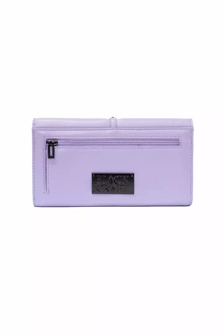 Faux leather slim clutch wallet features gunmetal finish pentagram harness on front. 16 credit card slots inside as well as an interior and exterior zip pocket.