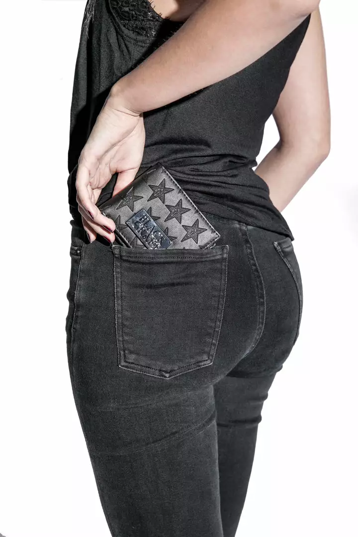 Faux leather bi-fold wallet with 6 credit card slots and bill compartment. Allover embossed baphomet print and gunmetal finish logo plaque hardware.