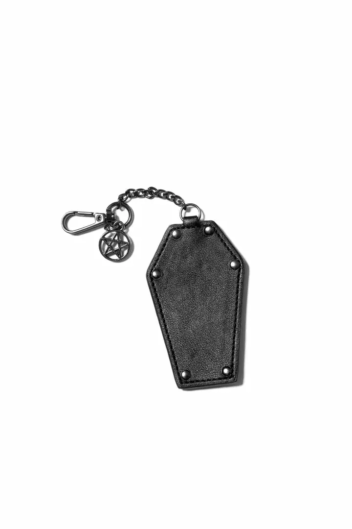 Faux leather stitched coffin keychain with BCC Goat embossed details. Pentagram charm gunmetal hardware. Lobster claw allows for easy addition to bags and/or keyring.