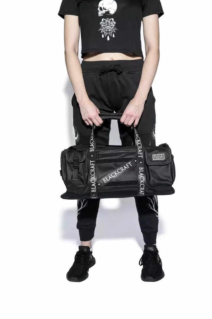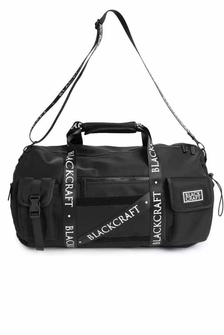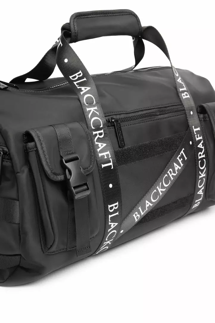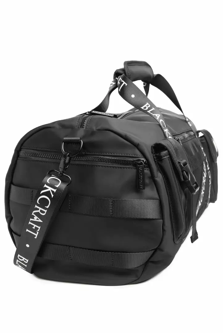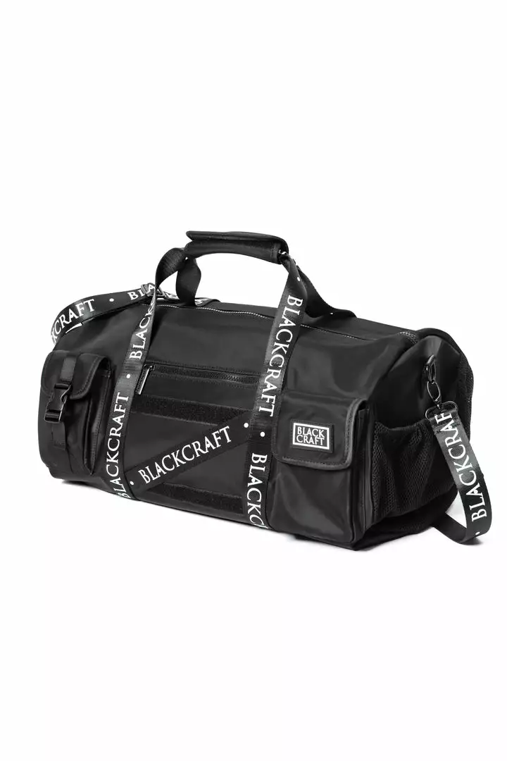 Nylon duffel bag with Blackcraft rubber logo. Blackcraft logo strap details, Velcro strapped handle, and removable shoulder strap. Features 1 mesh side pocket, 1 zip side pocket, 2 front pockets (perfect for phones!), and 1 zip front pocket. Blackcraft custom interior lining with pockets as well.