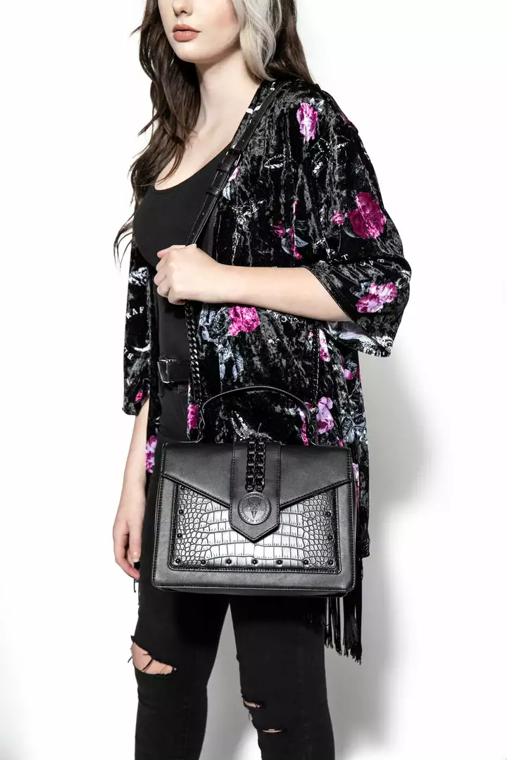 Faux leather square top handle with adjustable and removable crossbody strap. Flap magnetic button closure with matte black Believe in Yourself hardware and chain detailing.