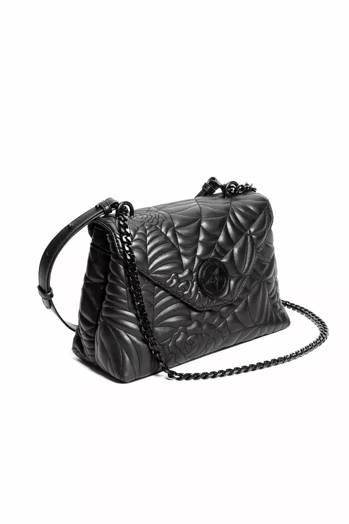 Spider web inspired shoulder bag with adjustable strap. Features flap closure with matte black Believe in Yourself hardware.