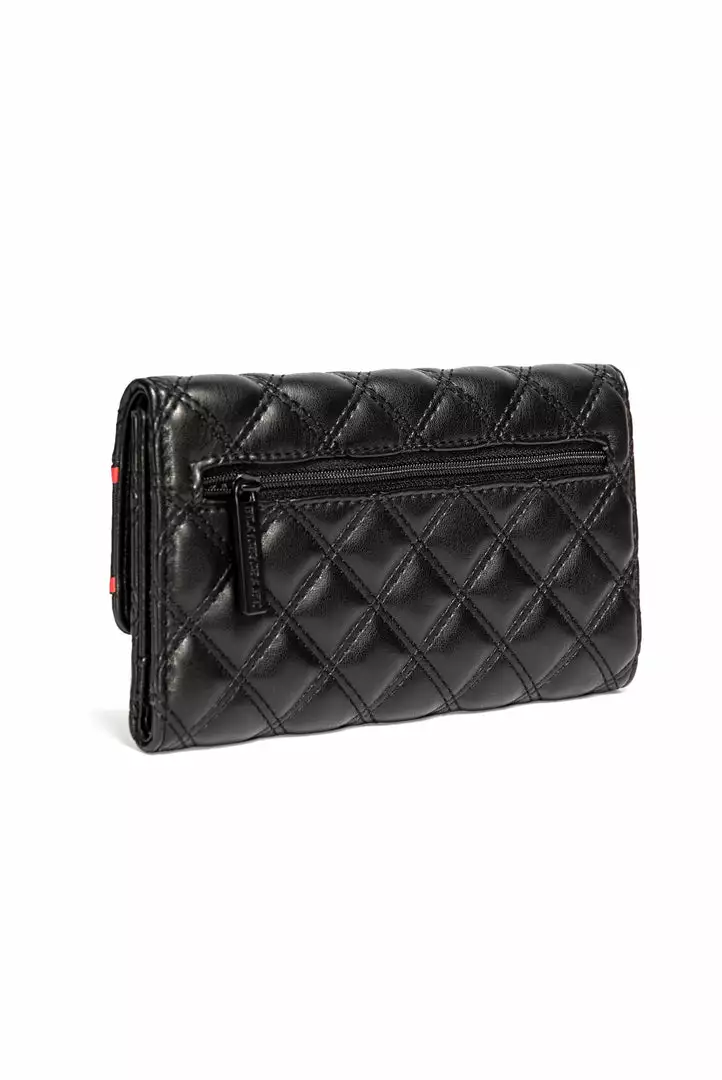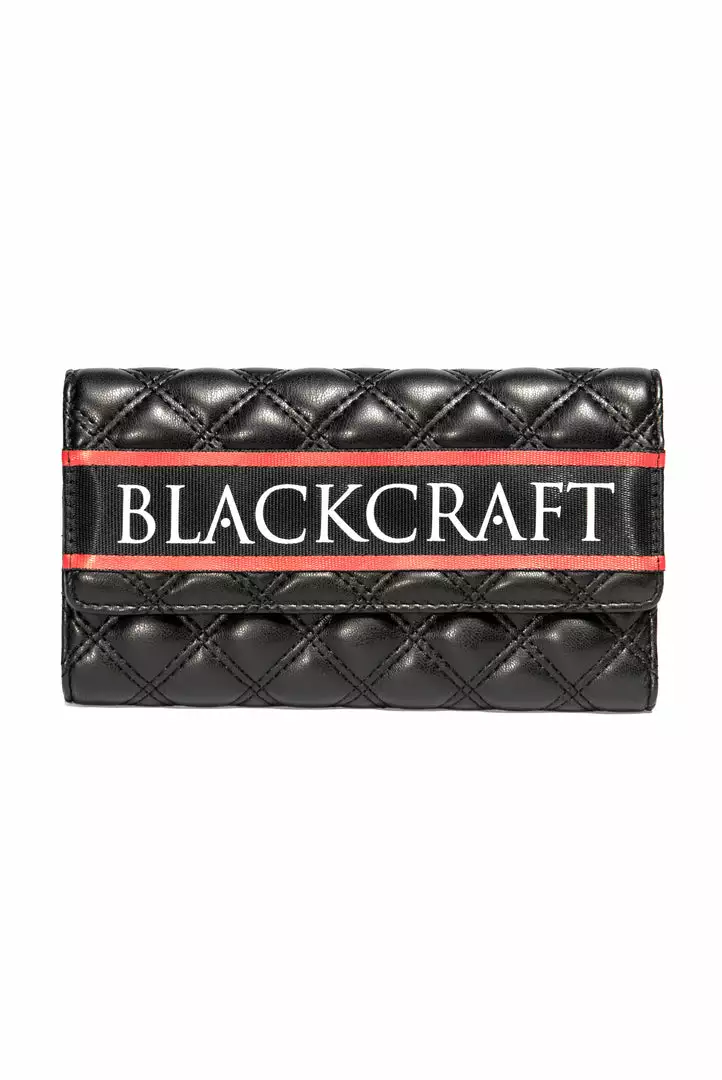 Faux leather slim clutch wallet features quilted design with Blackcraft nylon logo tape. Includes 15 credit card slots, interior pockets, zip pockets.