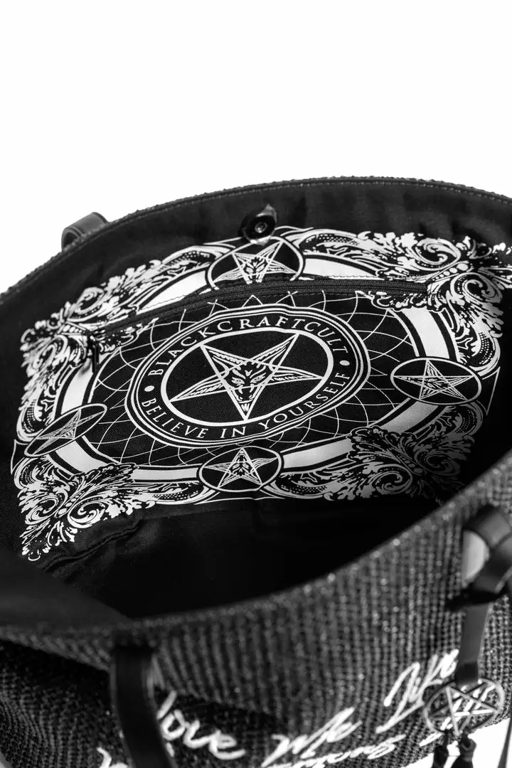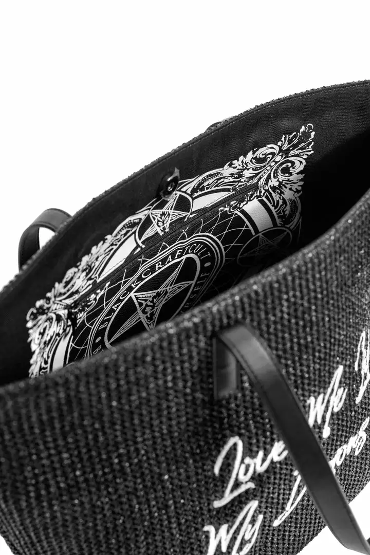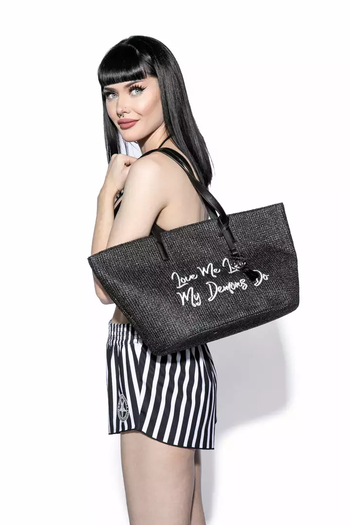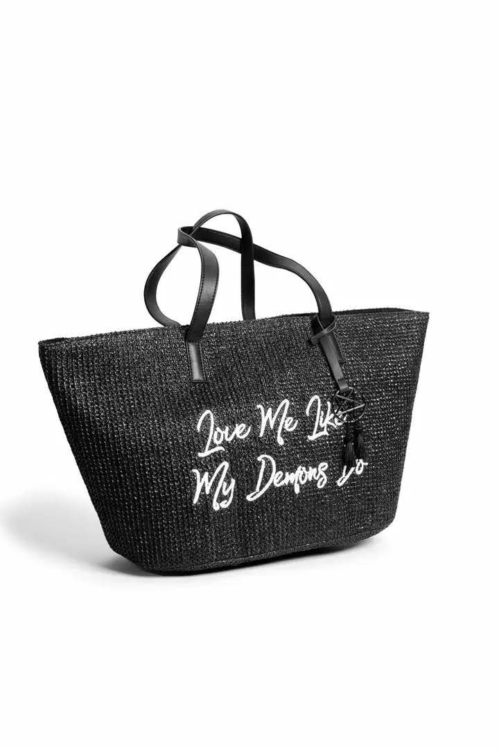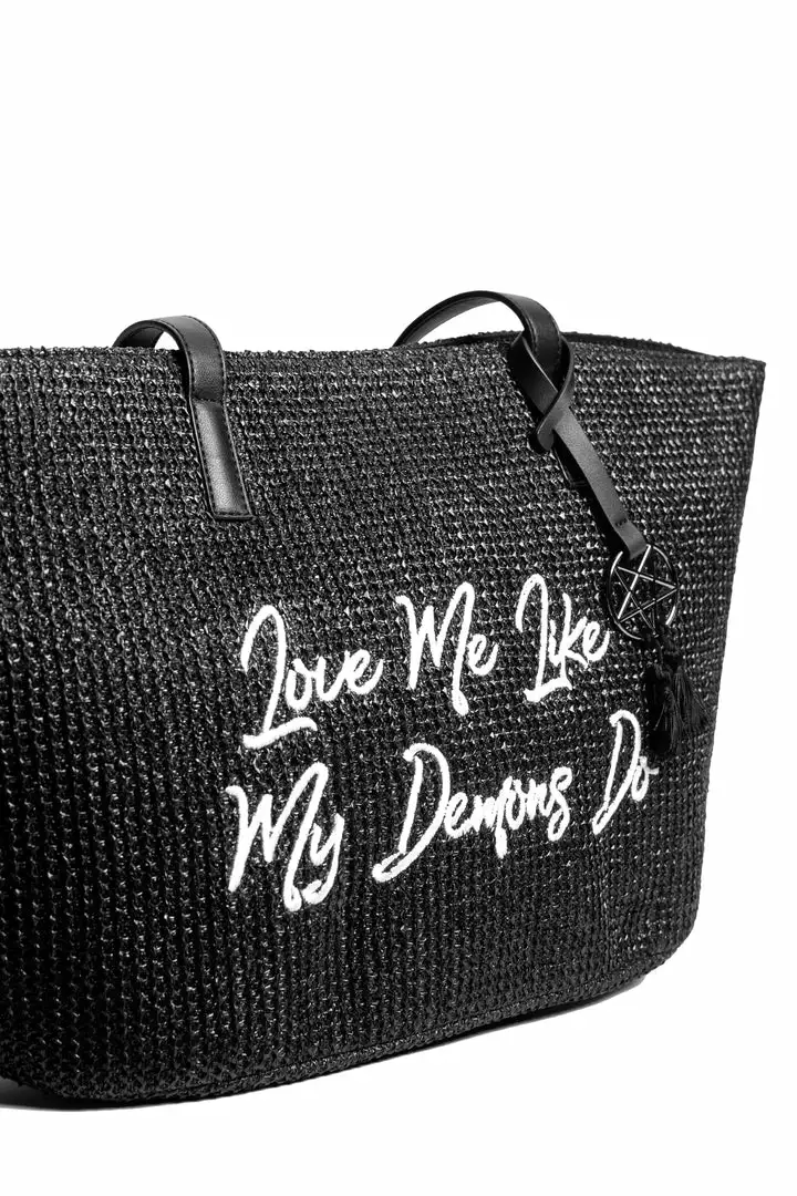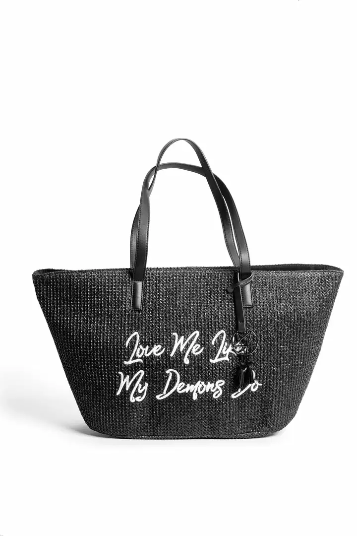 Straw Tote with embroidered “Love Me Like My Demons Do” detail. Features an inside pocket.Â