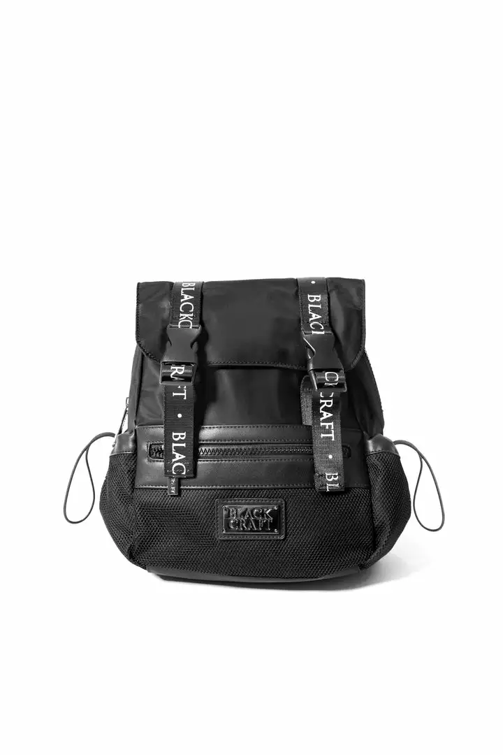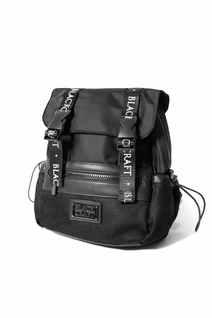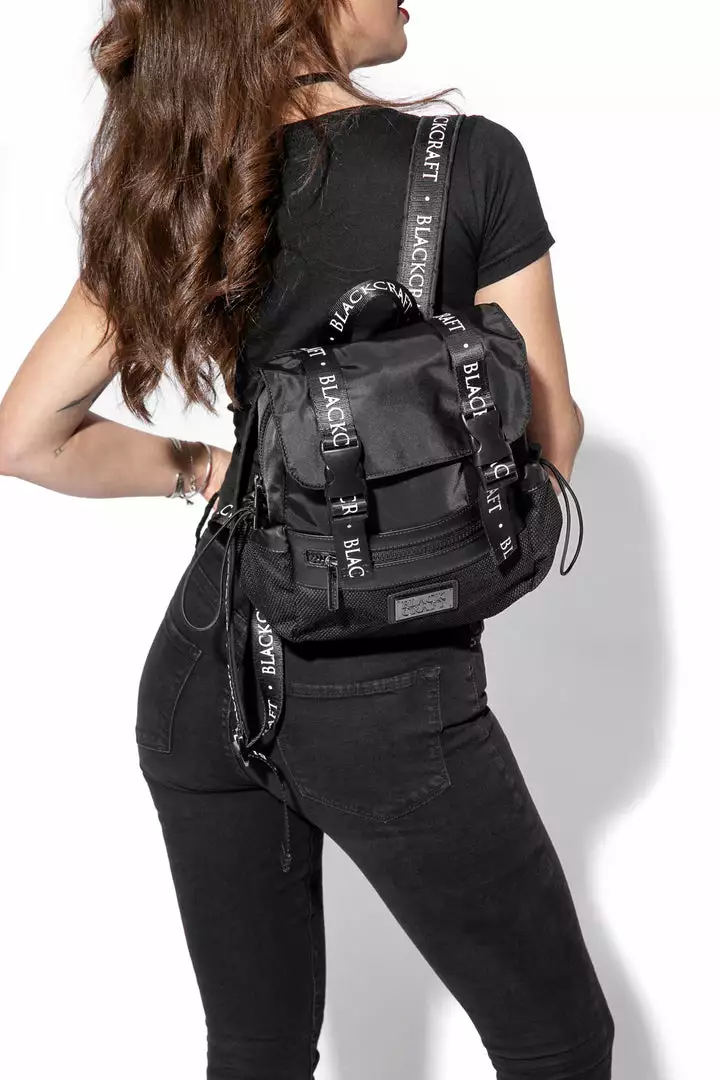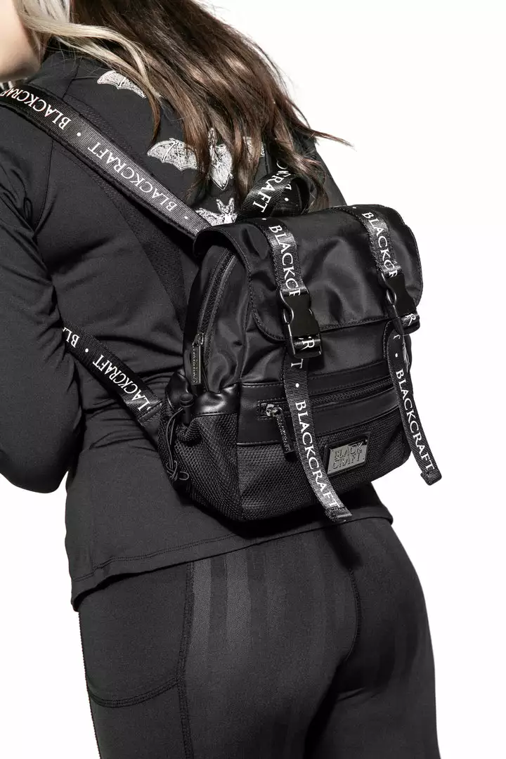 Mini mesh utility backpack with logo strap details and adjustable logo straps. Features elastic cord side closure and Blackcraft gunmetal logo plaque.