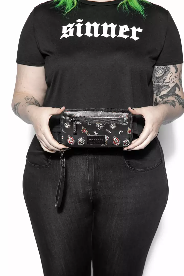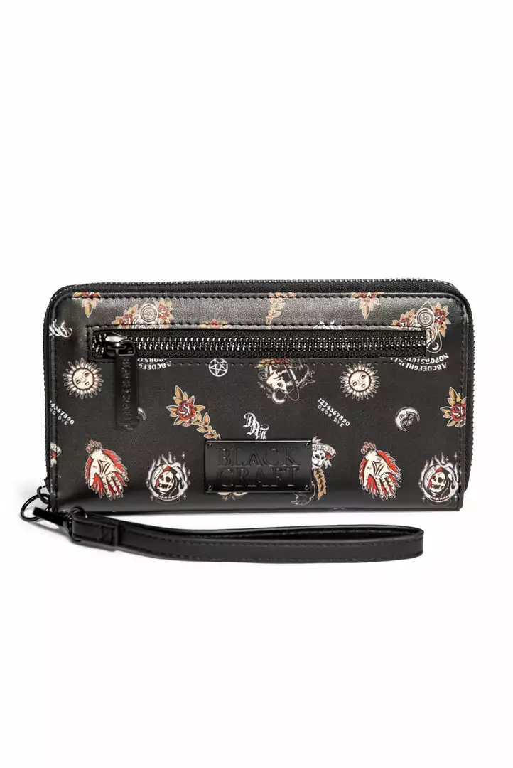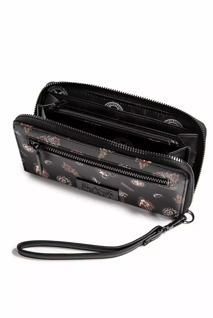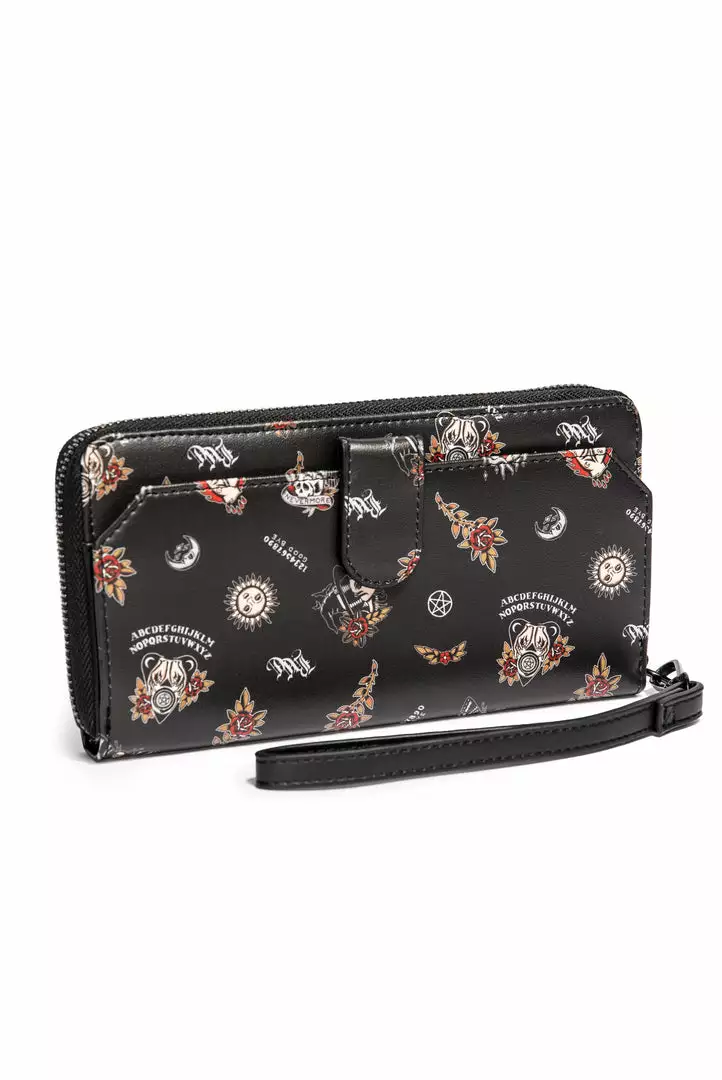 Faux leather zip around wallet features all over Ouija Flash print with black logo hardware. Includes credit card slots, zippered pockets, interior pockets, exterior zip and button closure pockets. Wrist strap included.