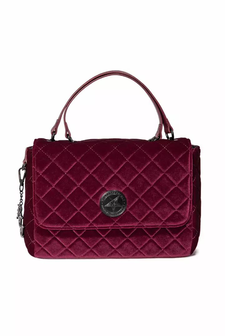 Lux oxblood velvet satchel with flap closure. Quilted design with matte black hardware, chain and leather straps, and BCC keychain. Straps can be used as a shoulder bag or crossbody bag.