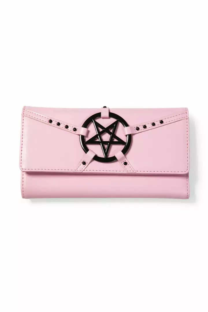 Faux leather slim clutch wallet features gunmetal finish pentagram harness on front. 16 credit card slots inside as well as an interior and exterior zip pocket.