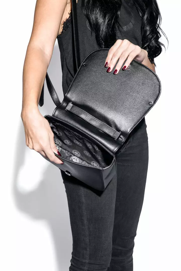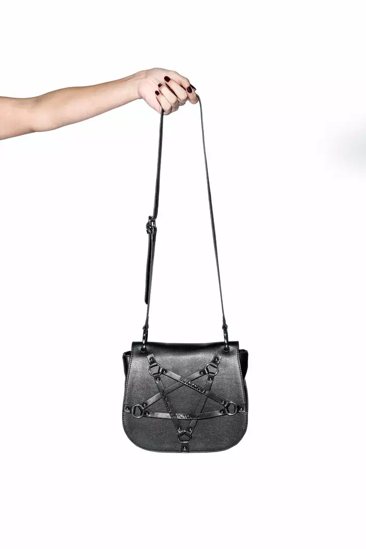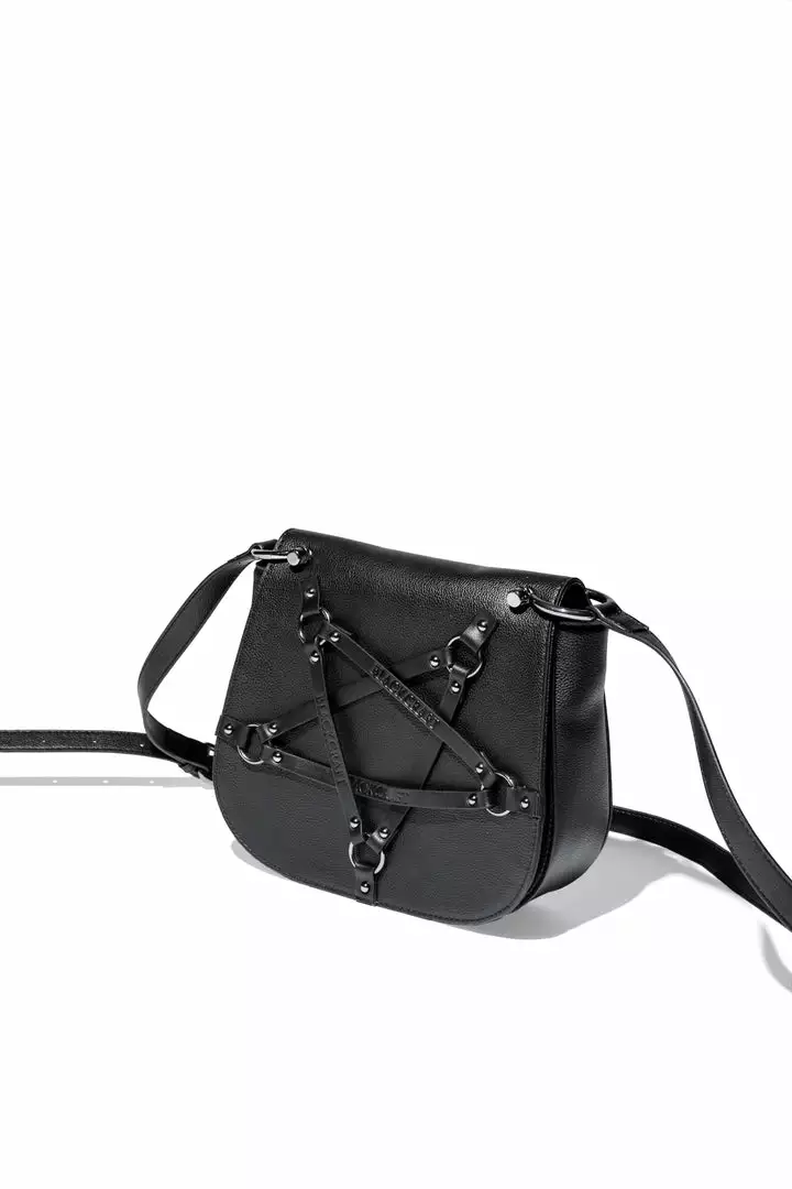Faux leather crossbody with Blackcraft logo embossed pentagram harness on front flap. Features gunmetal hardware as well as custom interior lining.