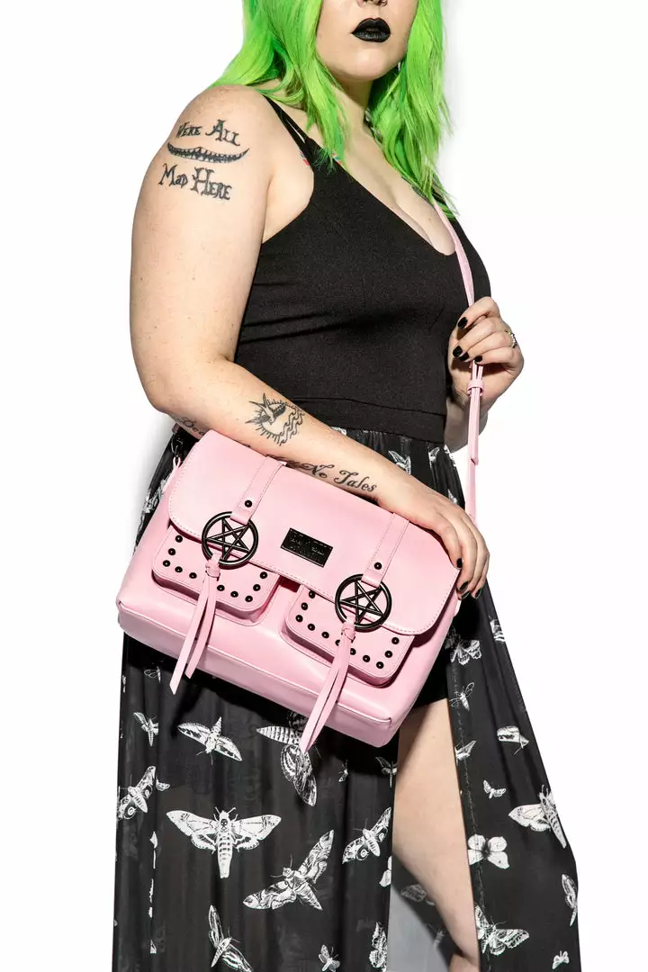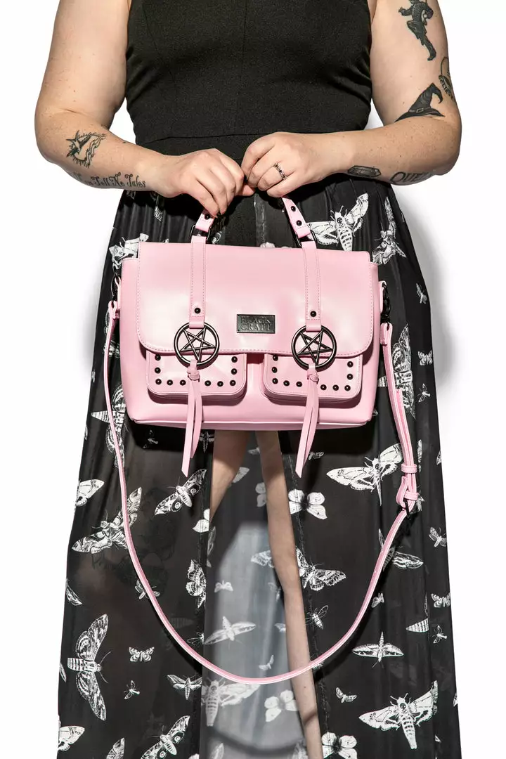 Pink faux leather messanger bag with matte black finish pentagrams and Blackcraft logo plaque. 46″ adjustable removable crossbody strap included. Interior features 1 zip pocket, 1 slit pocket and custom interior lining.