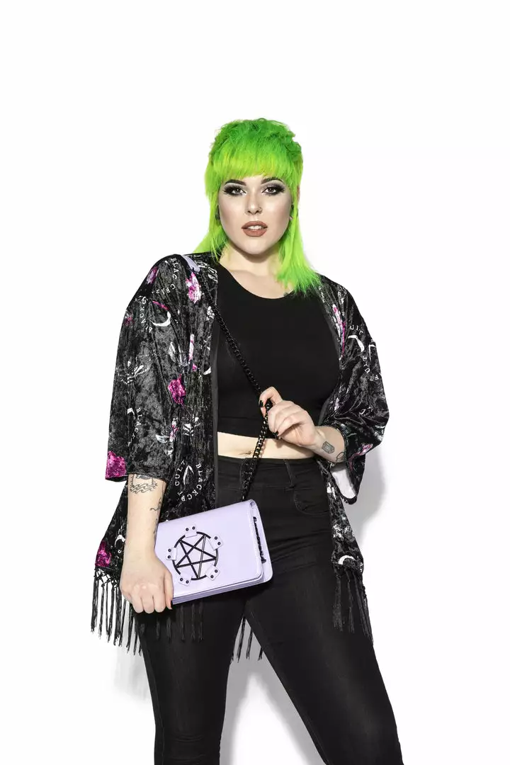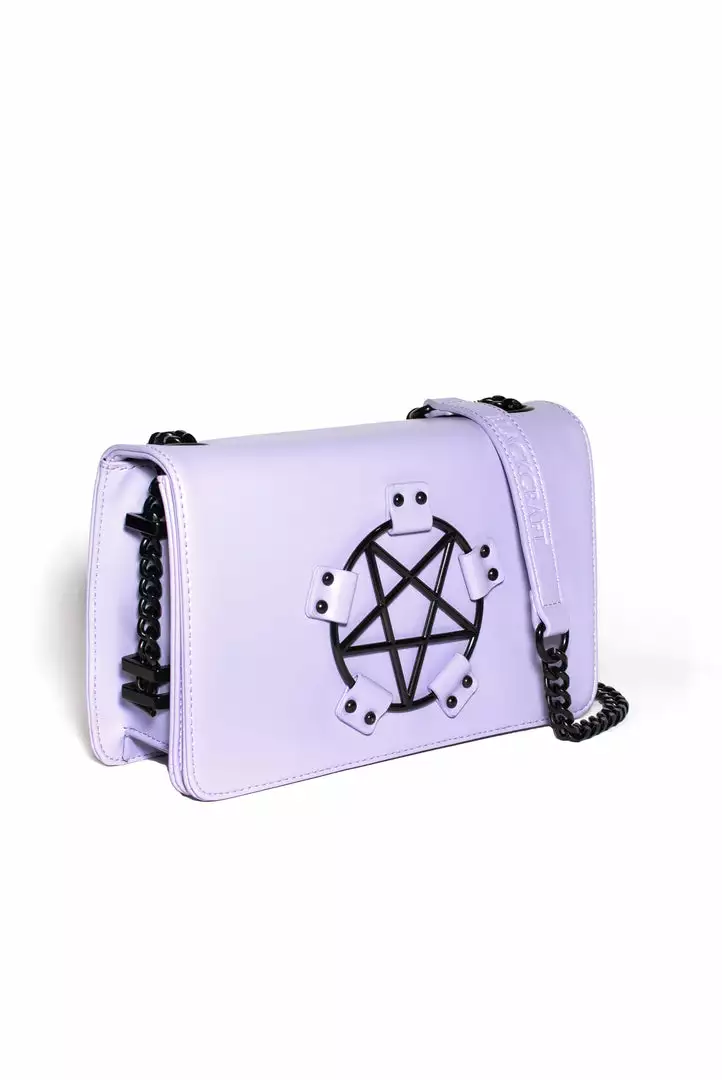 Faux leather crossbody with gunmetal finish pentagram hardware detail.