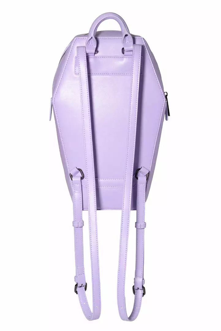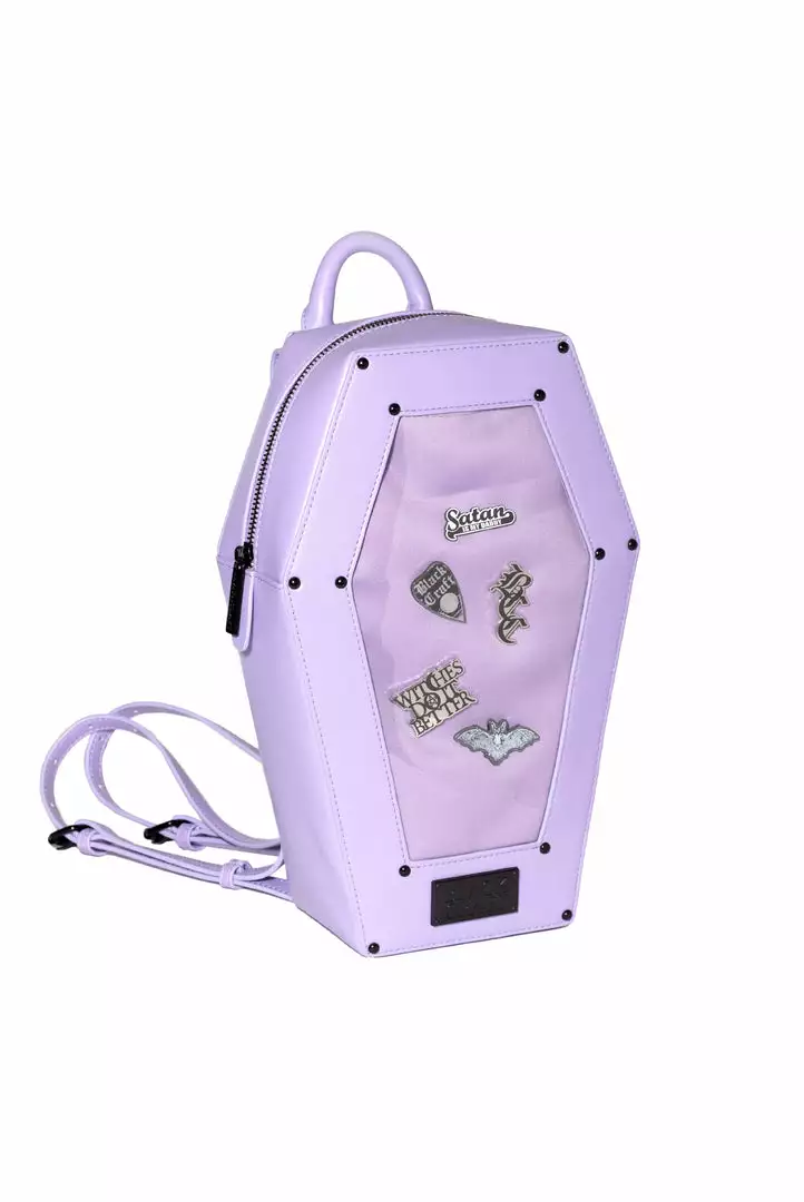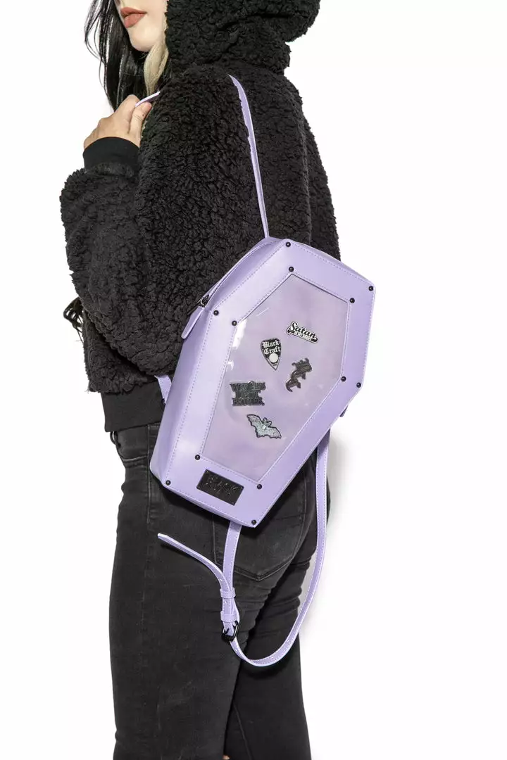 Faux leather coffin shaped backpack with a Pin Collecting Window. Faux leather material paired with matte black hardware. Features adjustable straps.
