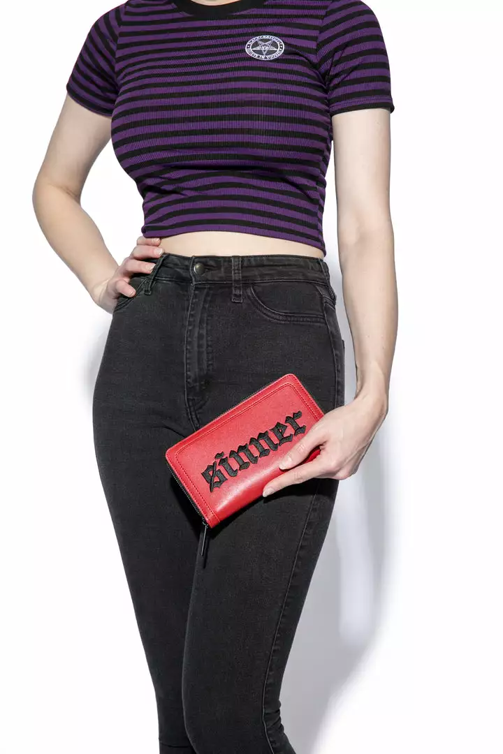 Faux leather zip around wallet with Sinner embroidered on front. Gunmetal finish Blackcraft logo zipper and metal plaque. Features interior zip pocket as well as 12 credit card slots and custom interior lining.