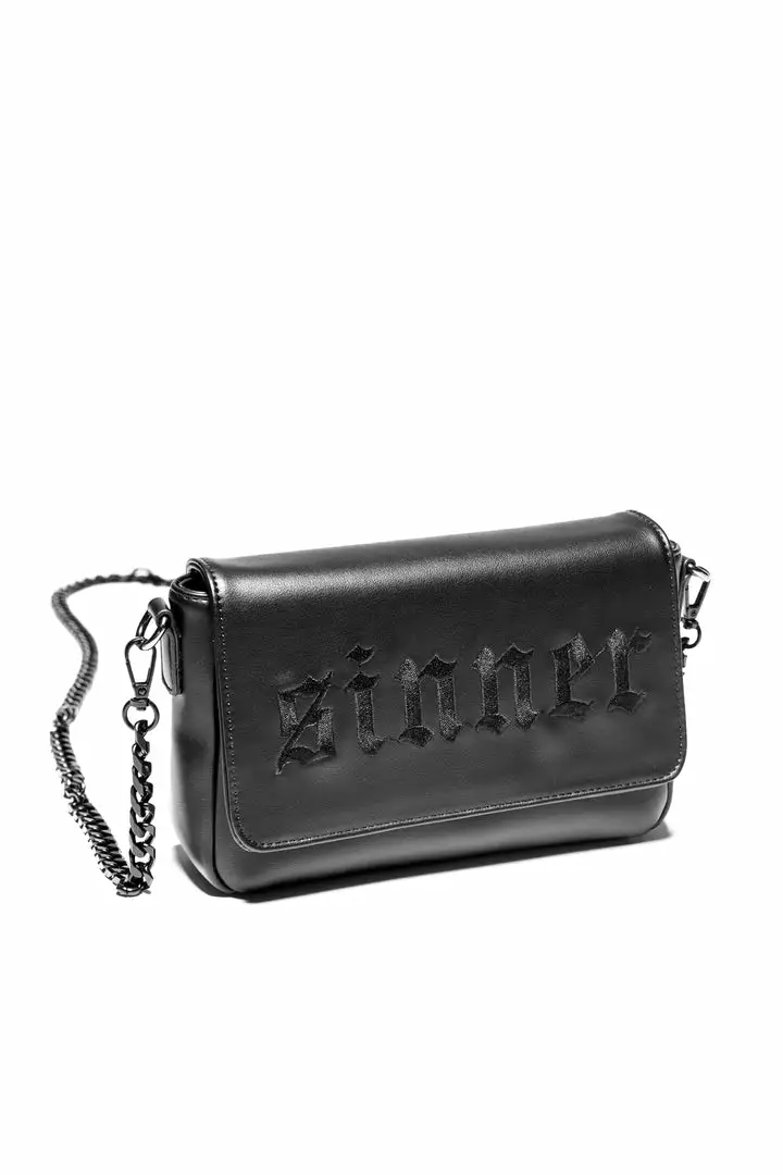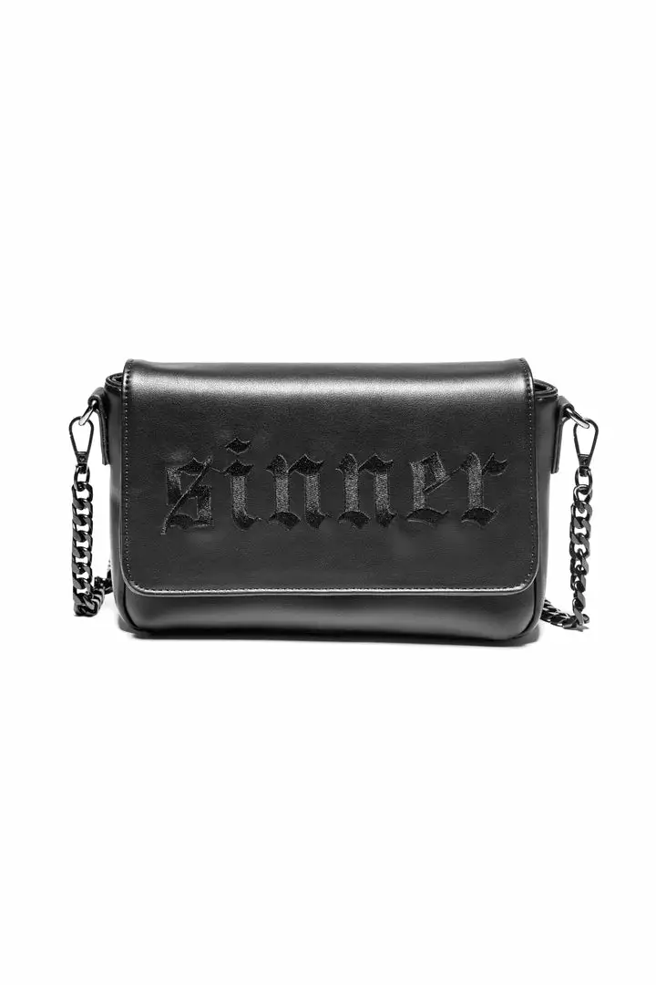 “Sinner” embroidered text on faux leather crossbody with matte black finish hardware and premium quality chain. Removable crossbody strap allows to be carried as a clutch. Custom interior