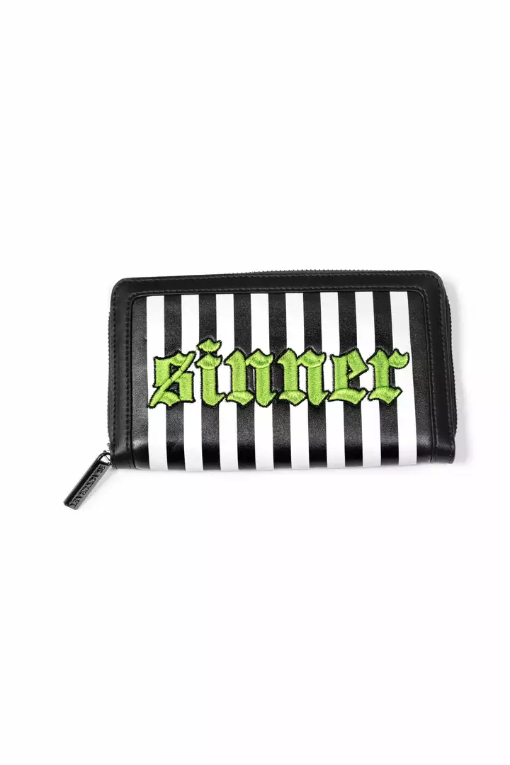 Faux leather zip around wallet with Sinner embroidered in green on front. Gunmetal finish Blackcraft logo zipper and metal plaque. Features interior zip pocket as well as 12 credit card slots and custom interior lining.